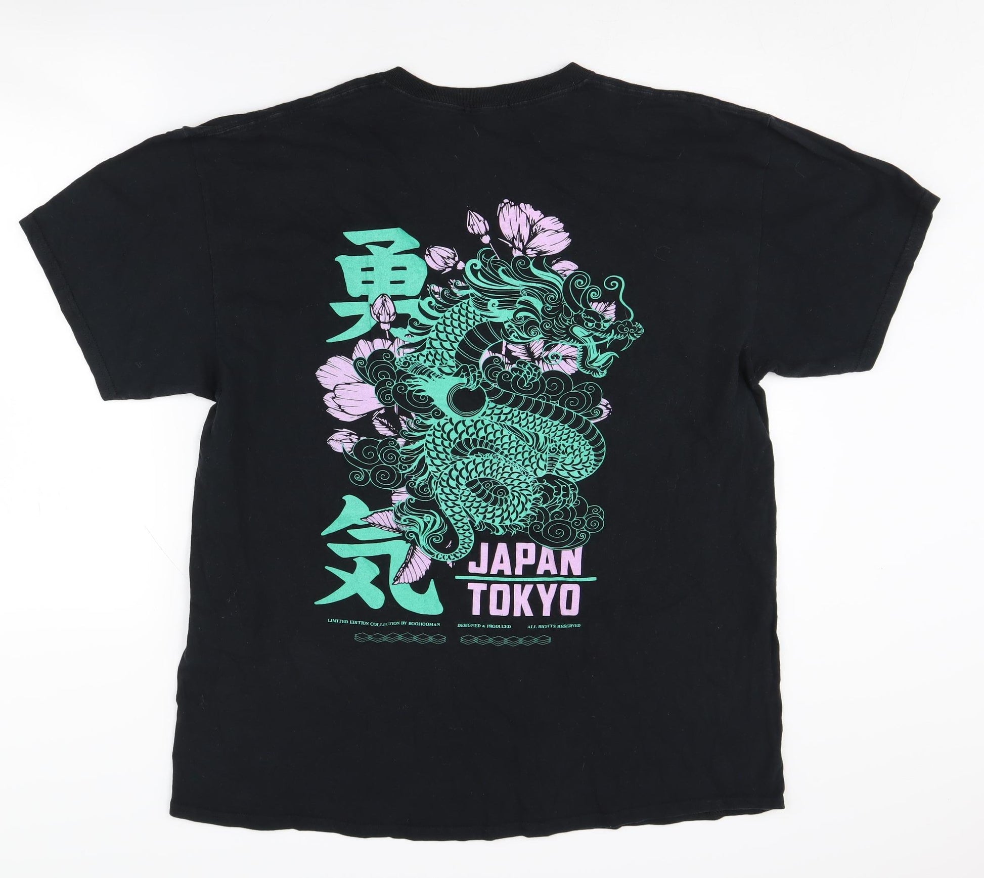 Elevate your casual wardrobe with this striking Black Graphic Print T-Shirt from boohooMAN, tailored for the fashion-forward man. Crafted from 100% cotton, this T-shirt ensures breathability and comfort, making it a perfect choice for the summer months. The bold Asian-themed graphic print on the back adds an edge that sets it apart, ensuring you make a statement wherever you go. The crew neck and short sleeves offer a classic fit that complements any physique, providing versatility whether you're heading out for a casual day with friends or planning a relaxed day at home. Machine washable for easy care, this T-shirt promises durability along with its style. Despite its lack of original sales tags, this T-shirt remains in excellent condition, with no noticeable wear and tear, affirming its quality and longevity for potential buyers. Priced affordably at £8.50, it's an attractive option for those seeking to spruce up their collection without breaking the bank. Add this unique piece to your wardrobe and showcase your distinctive style with confidence.