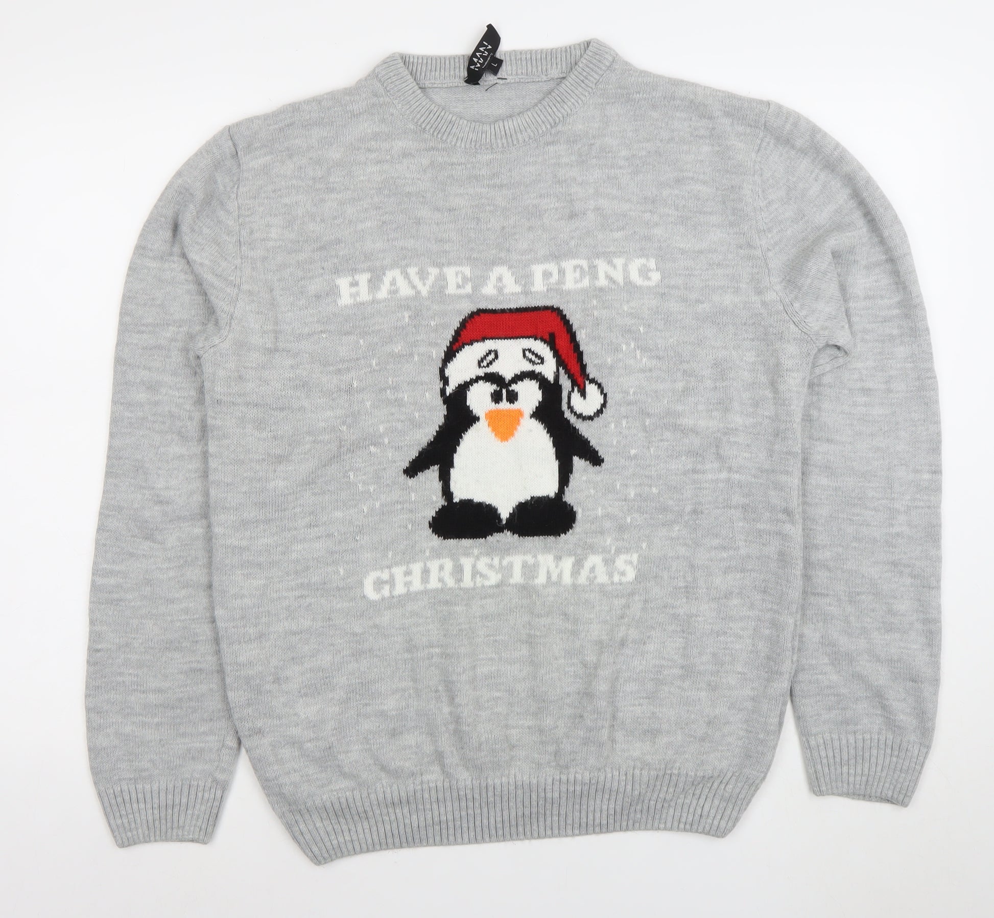 Get into the festive spirit with this boohooMAN men’s grey Christmas jumper, designed to keep you looking stylish and comfortable throughout the season. Crafted from soft 100% acrylic, this pullover offers a cosy yet lightweight feel, ideal for layering during chilly winter days. The fun design features a cheerful penguin wearing a Santa hat, along with the slogan 'Have a Peng Christmas', adding a humorous touch that’s perfect for festive gatherings, office parties, or casual Christmas outings.This jumper features a crew neck and long sleeves, offering a regular fit that suits most body types comfortably. The tight-knit fabric ensures warmth without bulk, while the ribbed trims at the cuffs, hem, and neckline offer a snug fit and help retain shape wear after wear. Its machine-washable acrylic material is easy to care for, saving you time during the busy festive season.The grey base colour provides a neutral background that lets the vibrant penguin motif stand out while keeping your outfit versatile. You can pair it with jeans or chinos for an effortless holiday-ready look. The playful theme and comfortable feel make this jumper a go-to winter favourite whether you’re celebrating at home or heading out for festive fun.Despite being preloved, this jumper remains in excellent condition with minimal signs of wear — offering superb value and plenty of life left. Ideal for those wanting an affordable yet stylish option for Christmas, this boohooMAN jumper promises comfort, fun, and warmth in equal measures. Add a touch of humour to your wardrobe and spread holiday cheer wherever you go. A great choice for men who appreciate comfort, character, and a dash of Christmas fun all in one garment.