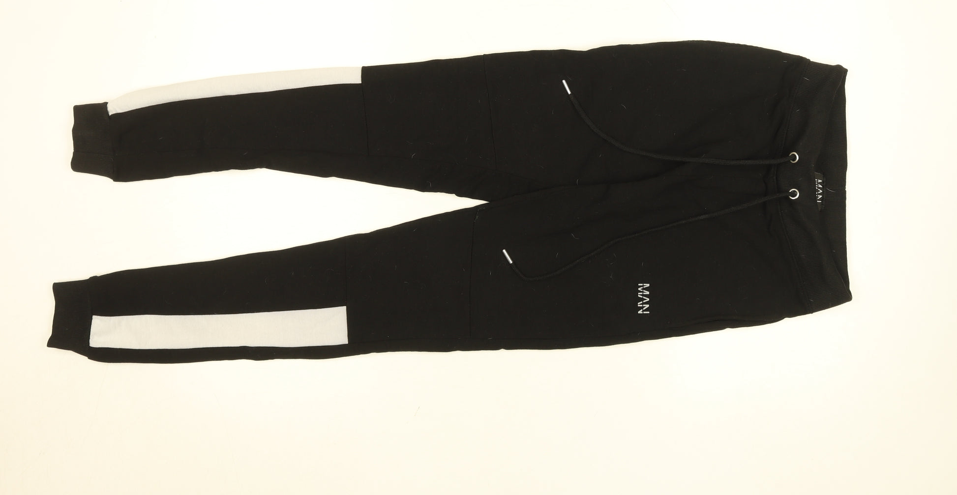 Step up your casual wardrobe with these stylish boohooMAN black jogger trousers, designed for both performance and everyday comfort. Crafted from a soft and breathable cotton and polyester blend, they offer a lightweight feel with enough stretch for ease of movement whether you’re in the gym, out for a run, or relaxing at home. The tapered fit gives a modern silhouette, while the elasticated waist and drawstring fastening ensure a snug and adjustable fit. Featuring sporty side stripe detailing and convenient side pockets, these joggers blend fashion with function effortlessly. The jersey fabric construction adds to the comfort, keeping you relaxed and comfortable throughout your day. Finished in classic black, they give a sleek and versatile look easily matched with hoodies, tees, or trainers for a complete athleisure outfit. Suitable for activewear, casual wear, or travel, they are ideal for men who value style and comfort in equal measure. These joggers are in excellent pre-owned condition with minimal signs of wear and have been well maintained. Whether lounging indoors or heading out for light activity, these boohooMAN joggers are your go-to trousers for contemporary, effortless style — a wardrobe essential at an affordable price. Add practicality, comfort, and on-trend appeal to your look with these versatile joggers from boohooMAN.