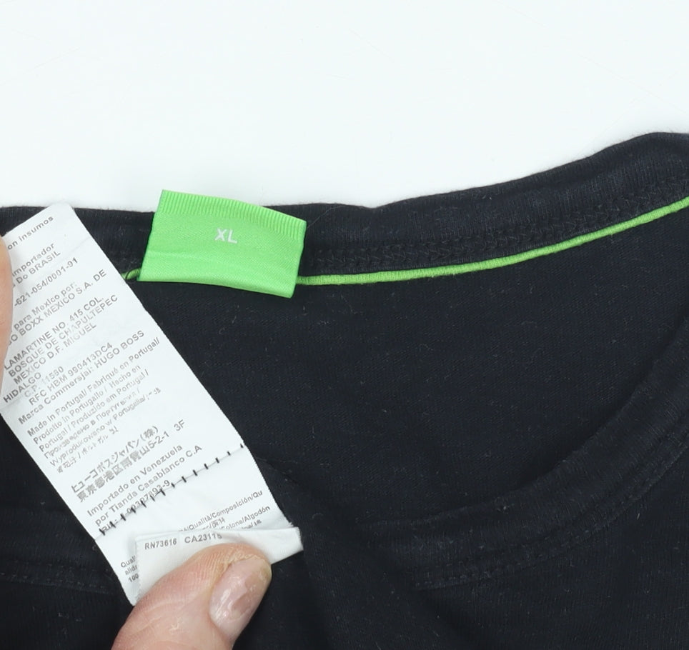 Elevate your casual wardrobe with this classic BOSS Men's Black T-Shirt in size XL. Crafted from 100% cotton, this tee promises comfort and breathability throughout the day. The solid black hue offers easy pairing with any bottom, while the subtle logo accents add a touch of sophistication to your look. Designed with a crew neckline and short sleeves, it’s ideal for everyday wear. The jersey fabric ensures a soft feel against the skin, and it's machine washable for easy care. Perfect for any season, this timeless T-shirt can be dressed up or down. Despite slight wear, it’s in excellent condition and will make a versatile addition to your collection.