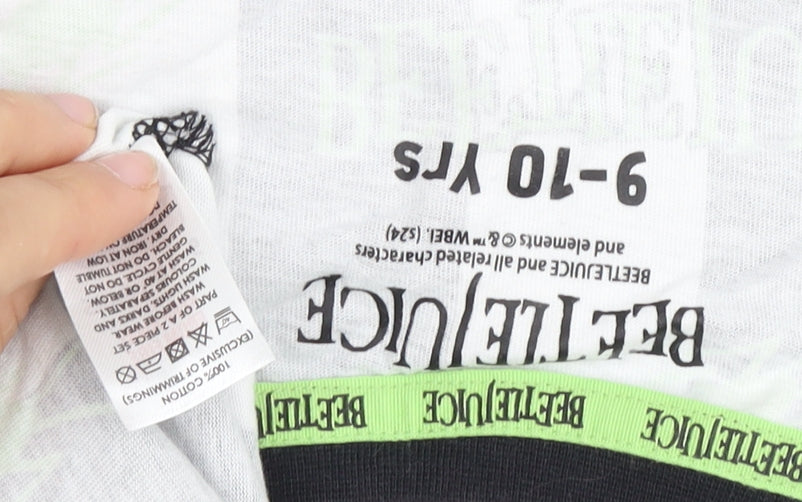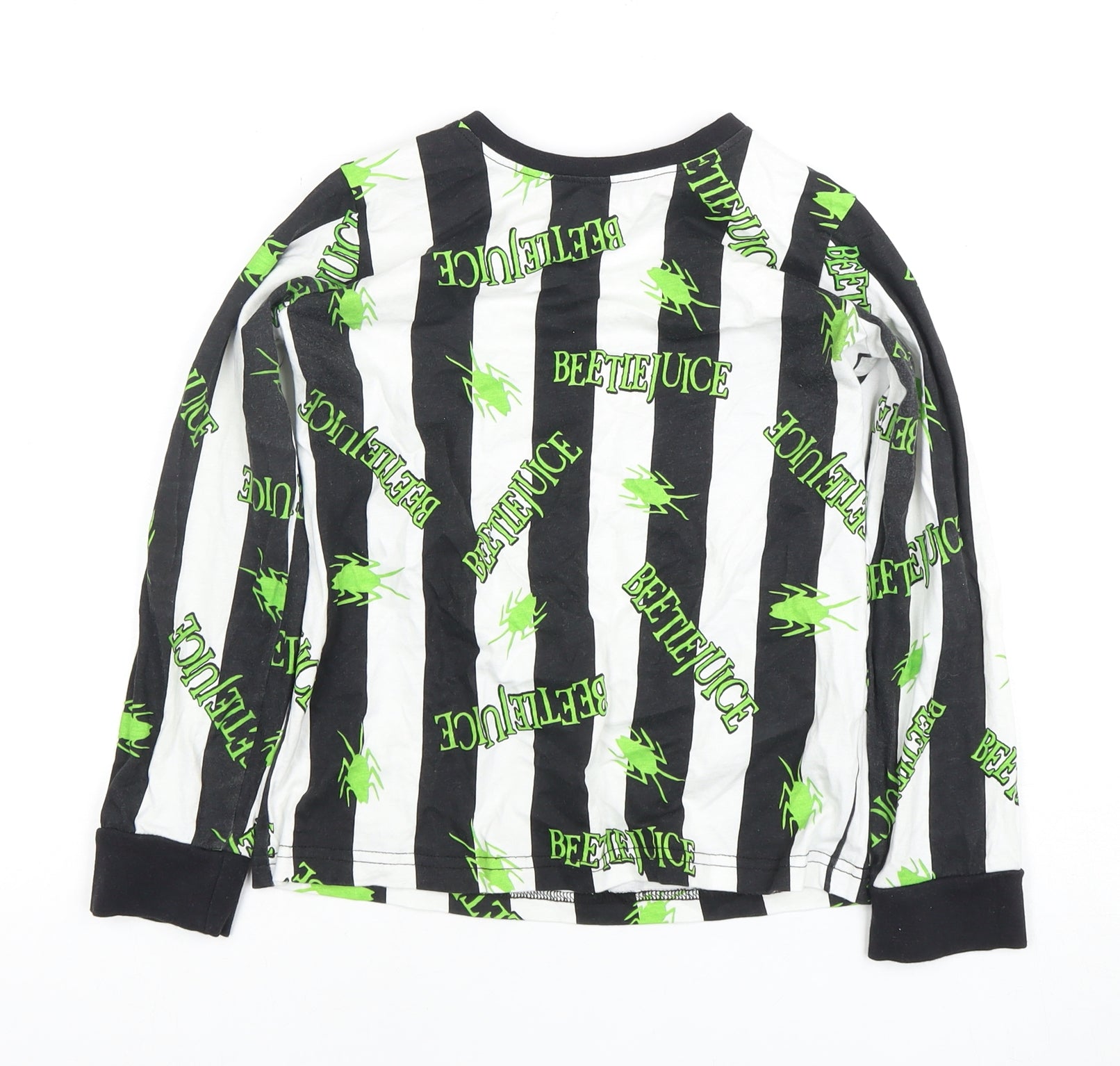 Delight your little one with this vibrant Beetlejuice pyjama top, designed to offer both comfort and style. Ideal for boys around 9 years old, this long-sleeved top brings the fun and excitement of the iconic Beetlejuice to their nightwear collection. Its easy pullover closure and round neck design make it a breeze to slip on during those chillier nights. Made from 100% cotton, this soft, jersey fabric promises a cosy fit that’s perfect for all seasons. The striking black and white striped pattern, accented with the lively 'Beetlejuice' graphics, captures the classic and comical spirit of the beloved character. Machine washable, it offers practicality for the busy parent without compromising on the fun factor. Whether it's for a cosy movie night in or a playful morning, this pyjama top ensures your child stays snug and stylish. Embodying the essence of fun and nostalgia, it's a must-have for any young Beetlejuice fan. Order now and add a touch of whimsy to your child's bedtime routine!
