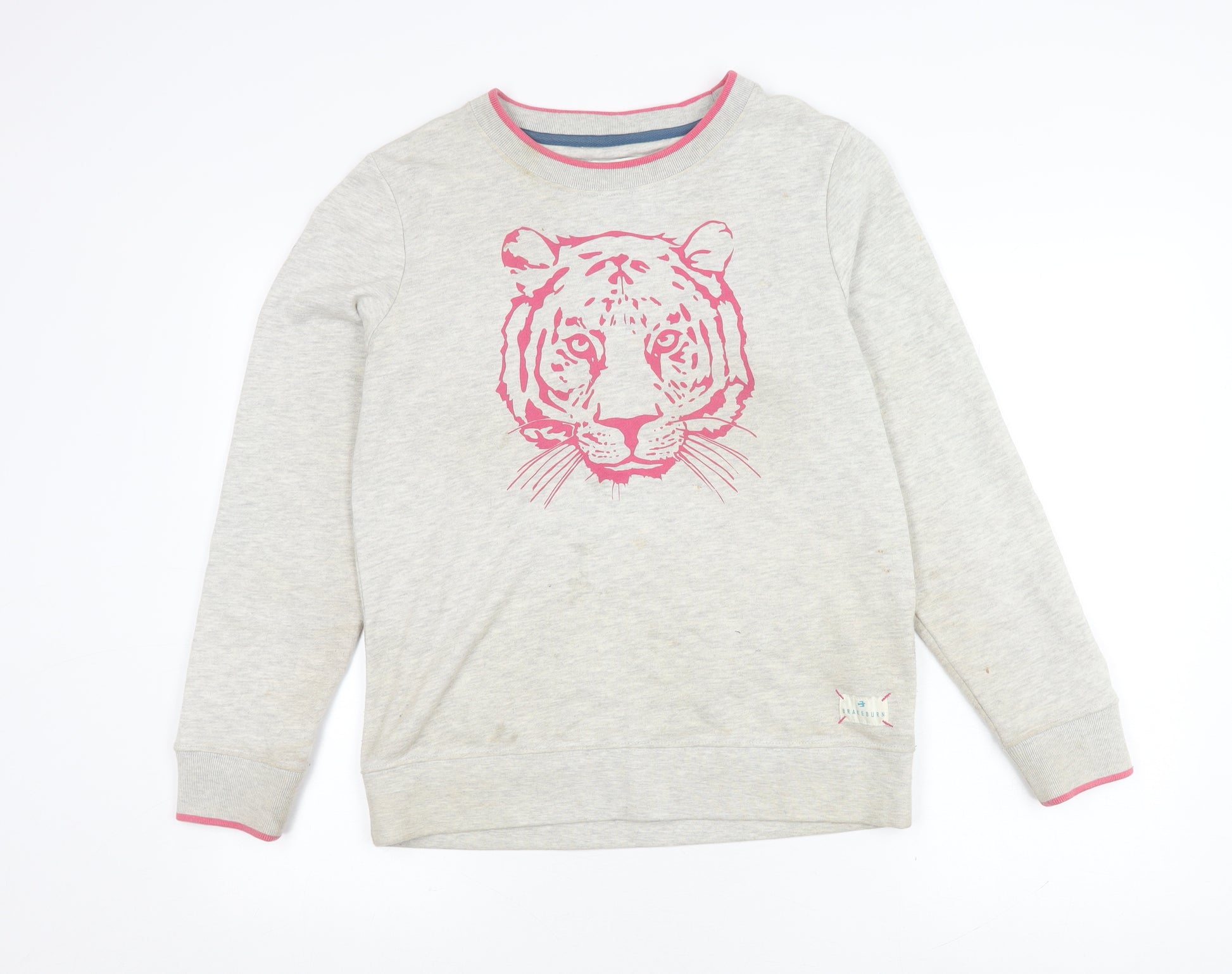 Stay cozy and stylish in this Brakeburn Women’s Grey Pullover Sweatshirt. Perfect for autumn and winter, this sweatshirt features a vibrant animal print with a striking tiger motif, making it a standout piece in your wardrobe. Crafted from a soft knit blend of 60% cotton and 40% polyester, it ensures comfort and warmth. Designed with a classic crew neck and long sleeves, it’s perfect for casual outings. The logo accent adds a touch of brand authenticity. Though pre-loved, it remains in good condition with minor stains visible. Ideal for layering or wearing on its own, this pullover fits a size 10 regular and is easy to care for with machine washable fabric. Embrace the spirit of adventure and show off your wild side with this unique piece.