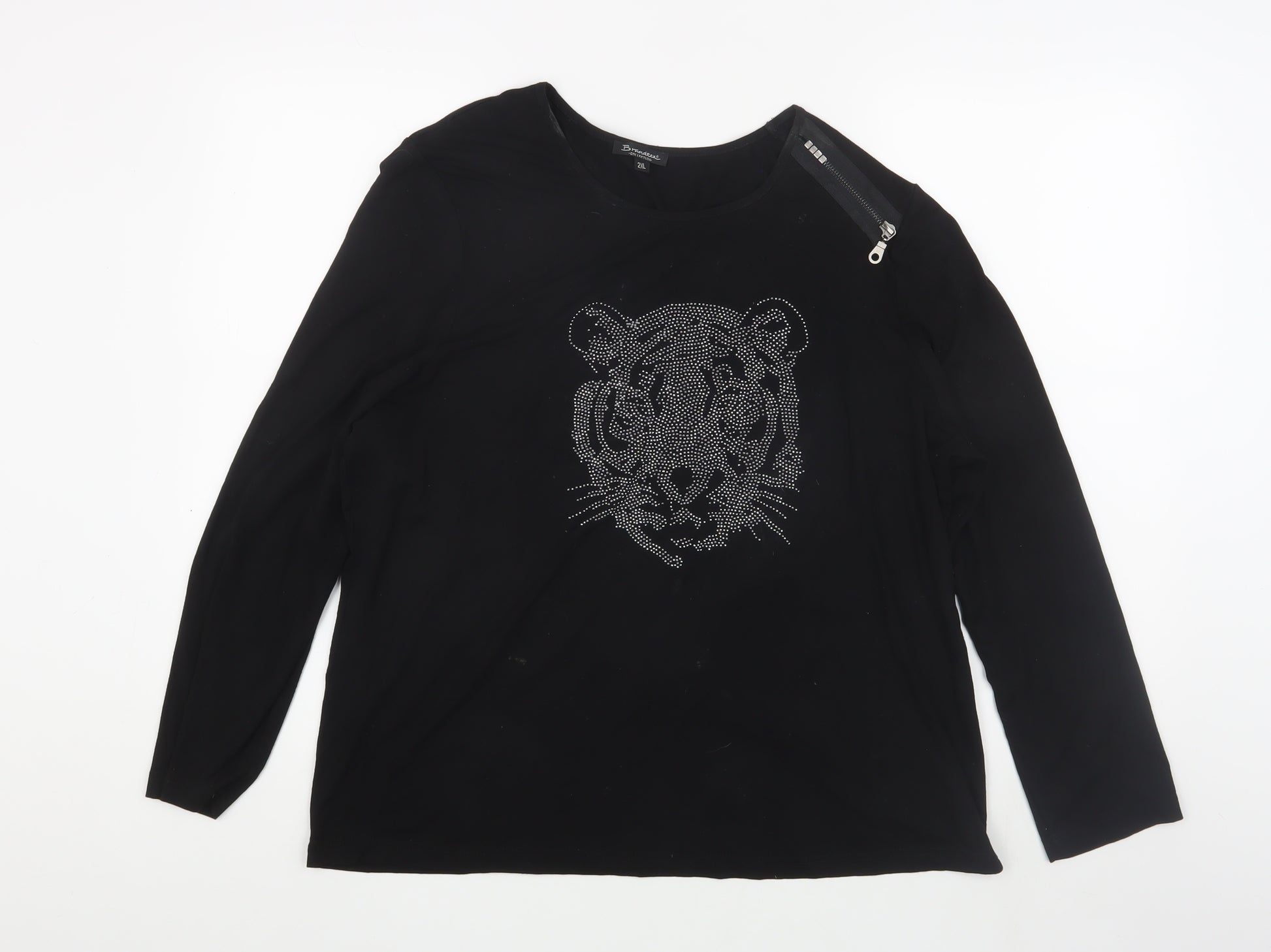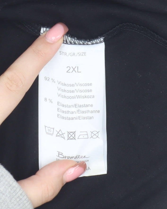 This elegant Brandtex top in size 2XL is a stylish choice for any wardrobe. Crafted from a smooth viscose blend with a touch of elastane, it ensures a comfortable fit and a sleek silhouette. The black fabric is adorned with striking rhinestone accents in an animal theme, adding a touch of glam to your look. Featuring long sleeves and a modern zip closure, this top is as functional as it is fashionable. Despite slight wear, it's in excellent condition with no original sales tags attached. Pair it with jeans for a casual outing or dress it up with a skirt for an evening affair. Ideal for those who appreciate contemporary fashion with an edge, this top is bound to become a favourite in your collection. Don't miss the chance to own this stunning piece. Priced attractively, it's a great value addition to your wardrobe.
