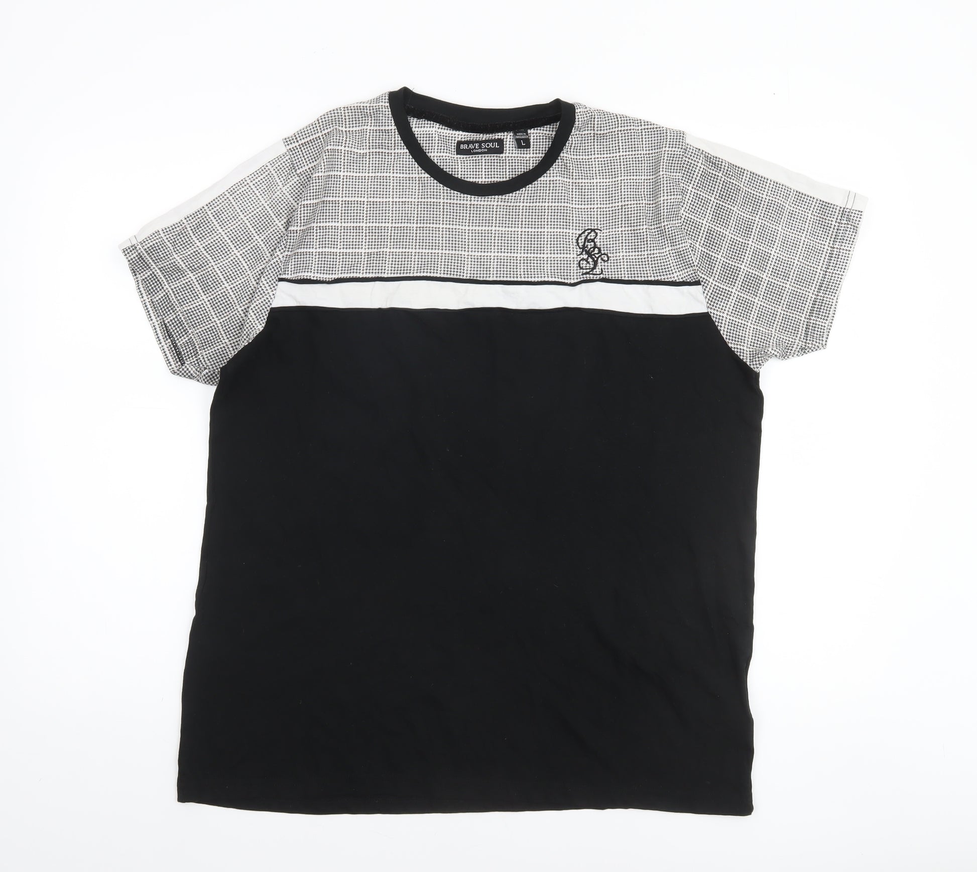 Men’s Black Check Panel Crew Neck Cotton T-Shirt Size L