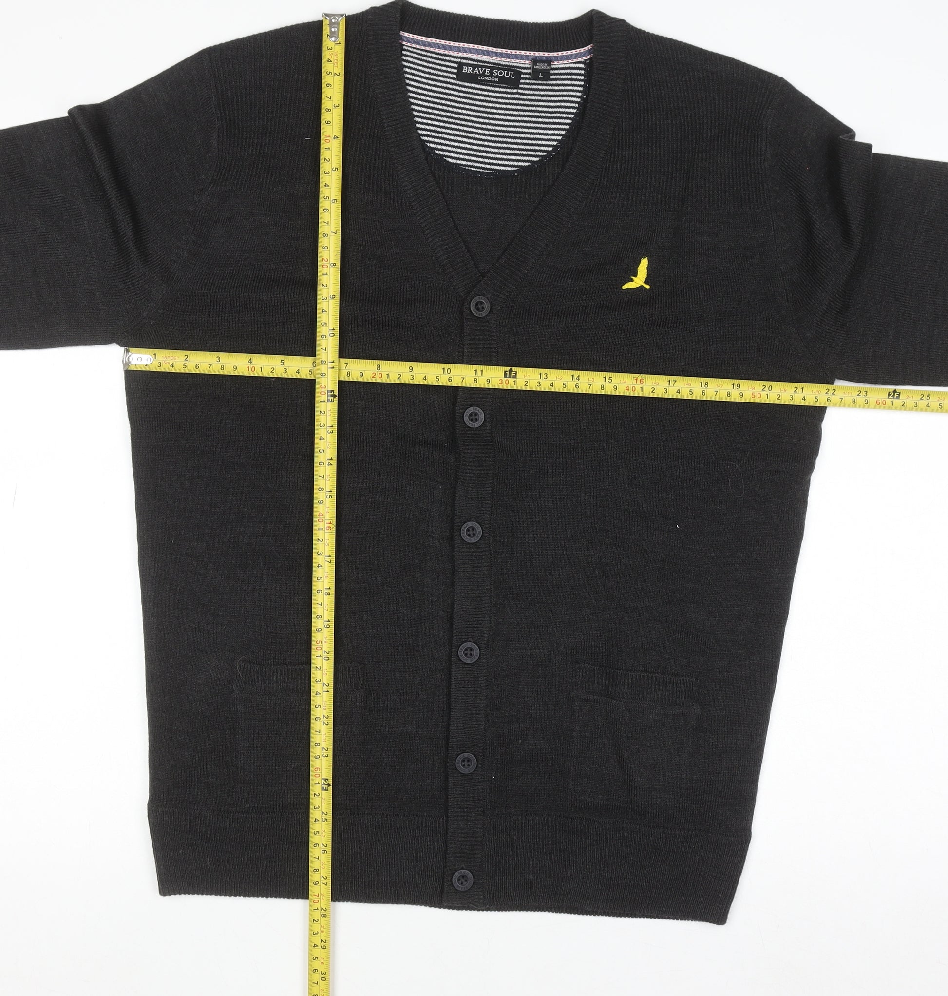 This Brave Soul men's black cardigan brings together effortless style, comfort, and versatility — ideal for adding a refined layer to any look. Crafted from 100% acrylic, the knit delivers a soft yet durable finish, designed for easy wear and care across multiple seasons. The smooth, tight-knit construction provides a lightweight feel that keeps you comfortable while maintaining a smart appearance. Styled in classic black, this cardigan complements both professional and casual outfits with ease, making it a wardrobe essential for any modern man.Designed with a flattering V-neckline and button-front fastening, it offers timeless appeal while allowing flexibility in styling — whether worn over a crisp shirt or paired casually with your favourite T-shirt. Subtle details such as the yellow embroidered logo on the chest add a touch of distinction without overpowering the look. Two front patch pockets add both practicality and texture to the design. The ribbed cuffs and hem contribute to a clean, structured silhouette that ensures a good fit across the shoulders and torso.This cardigan fits true to size, suitable for a regular build in size L, and is ideal for layering during cooler months or as light outerwear in transitional weather. Easy to maintain, the piece is fully machine washable, making it both stylish and convenient. Perfect for casual outings, the office, or weekend gatherings, this versatile piece can be dressed up with chinos or kept relaxed with jeans. Gently worn and in excellent condition, it shows minimal signs of use with no visible damage — ready to wear right away. With its blend of classic design and dependable quality, this Brave Soul black V-neck cardigan is a smart and reliable choice for men who value both comfort and understated fashion.
