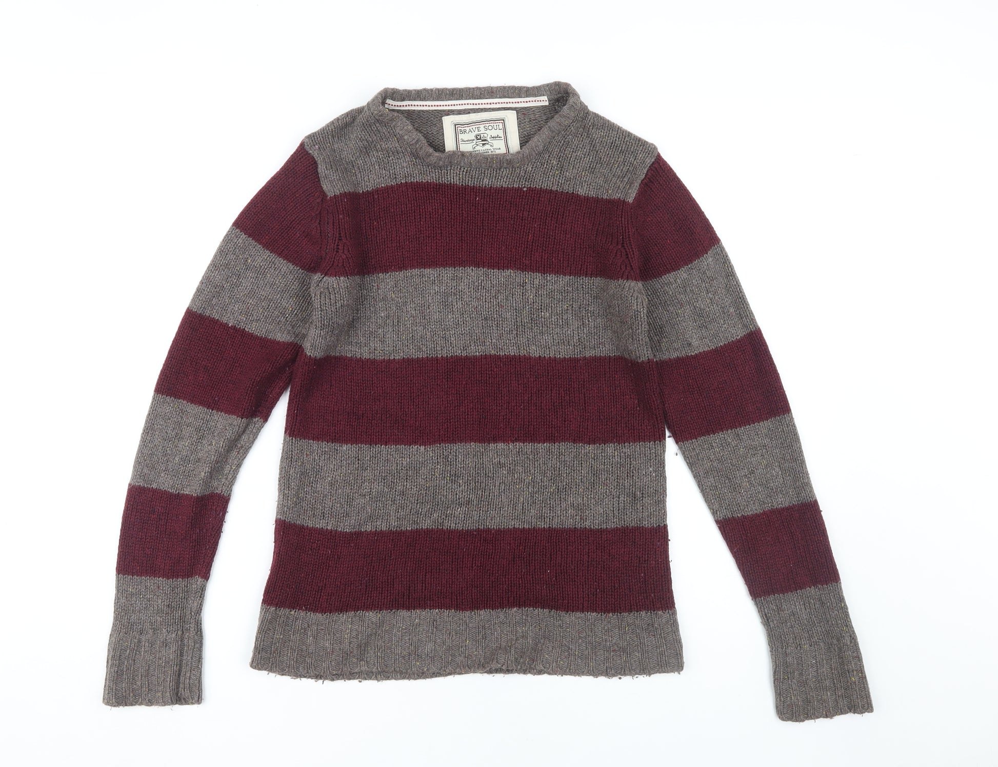 Introducing this stylish Brave Soul men's pullover jumper, perfect for the cooler months. Crafted in a striking multicoloured striped pattern, it combines shades of grey and burgundy for a chic look suitable for casual outings or relaxed weekends. This jumper is made of a warm wool and acrylic blend, ensuring you stay comfortable and cosy throughout autumn and winter. The crew neckline adds a classic touch, providing a versatile option for layering or standalone wear. With long sleeves and a regular fit, it accommodates active movements while providing optimal coverage. Pair it with your favourite jeans or chinos for a relaxed yet refined ensemble. Designed for everyday wear, this jumper can effortlessly transition from casual days to more festive evenings. The Brave Soul brand is known for its commitment to high-quality fashion, making this a reliable addition to your wardrobe. Available in size L, this jumper suits a variety of body types with its regular fit. Don't miss out on the chance to own this timeless piece that blends functionality with style.
