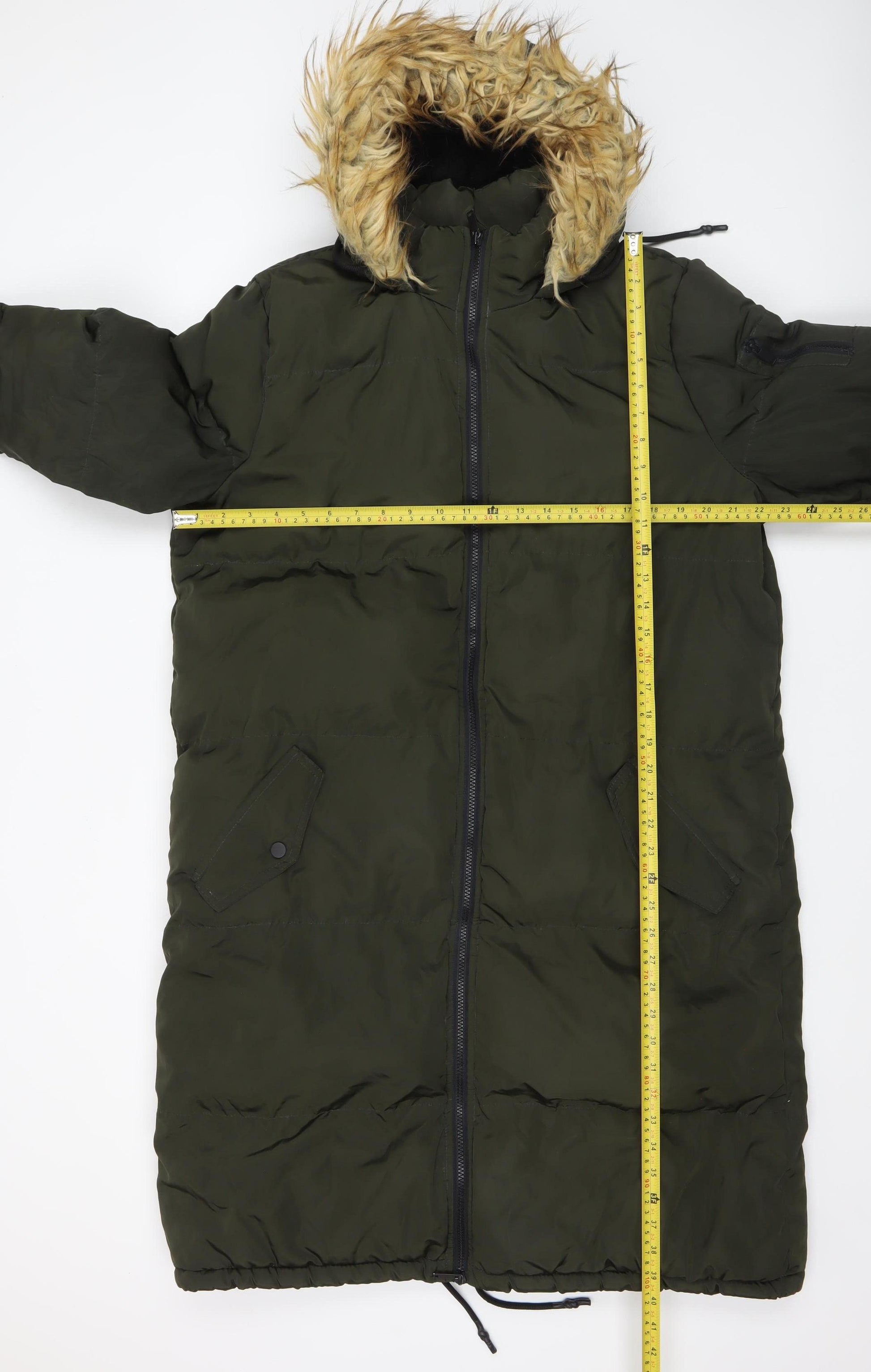 Women’s Green Long Puffer Coat Faux Fur Hood Size 16