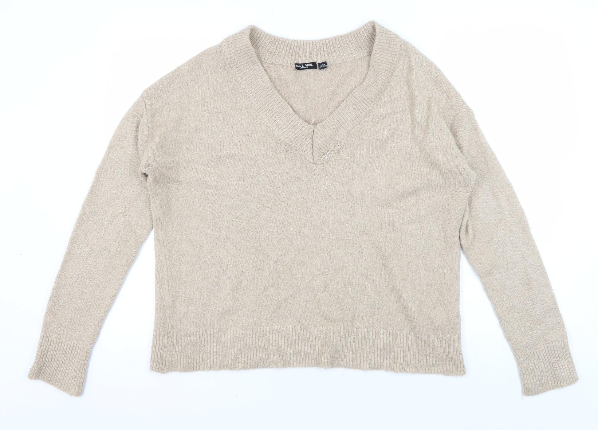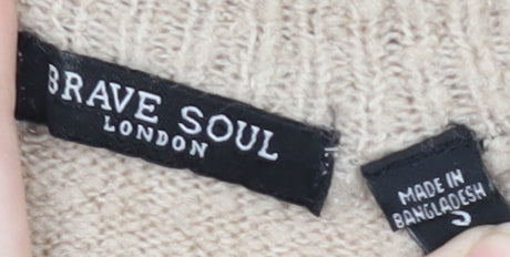 Step into style with the Brave Soul Women's Beige V-Neck Pullover Jumper, a versatile essential for your wardrobe. Perfect for women who value both comfort and fashion, this jumper is crafted in a timeless beige hue that complements any outfit. The acrylic material ensures a soft touch and warmth without compromising on breathability. Designed in a flattering V-neck style, it adds subtle elegance to your look, whether worn alone or layered. Featuring long sleeves, it's an ideal choice for transitioning through the seasons, providing warmth and style in one. Despite being gently worn, it remains in excellent condition, ensuring you'll carry this piece with confidence. The simple pullover design allows for easy wear, making it a perfect choice for casual outings or a laid-back day at home. This jumper is sized 'S', fitting regular dimensions, which makes it versatile for various body types. Pair it with jeans, skirts, or trousers—the options are endless. This Brave Soul jumper is more than just a piece of clothing; it's a commitment to looking chic effortlessly. Discover the ease of owning a garment that combines practicality with a timeless aesthetic. Elevate your collection with the Beige V-Neck Pullover Jumper from Brave Soul, and enjoy a touch of understated sophistication in every wear. Get it now for the perfect blend of comfort, style, and durability.
