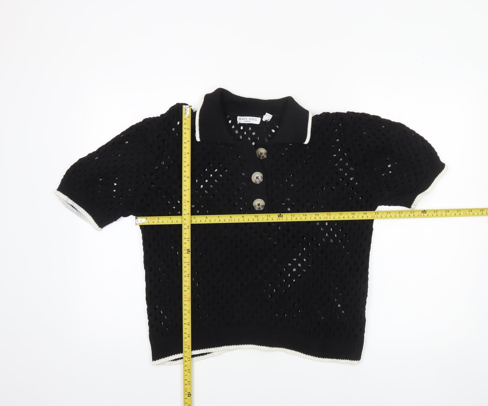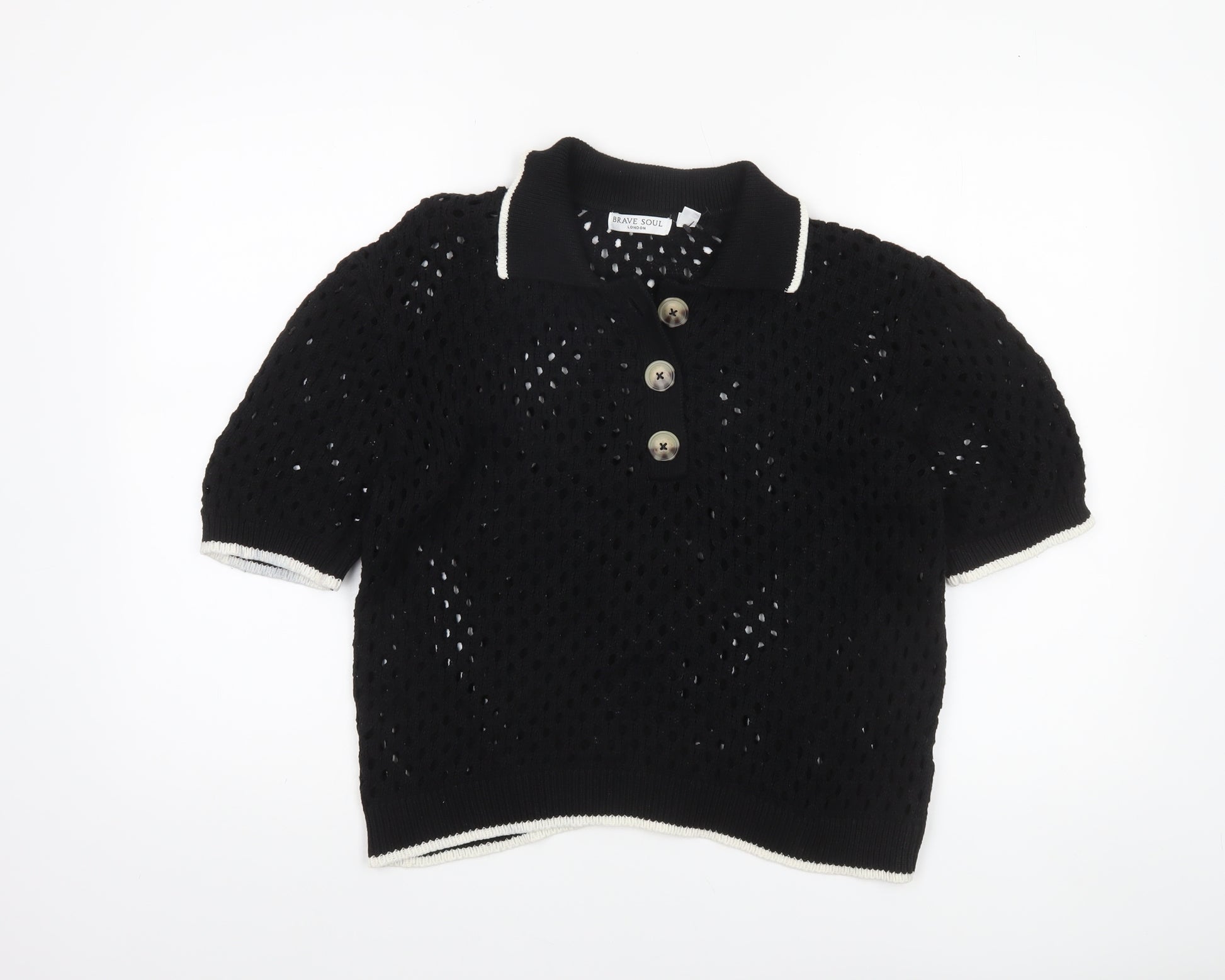 Add a touch of effortless style to your wardrobe with this Brave Soul women's open knit jumper. Crafted from a comfortable cotton and acrylic blend, this lightweight piece is ideal for layering through spring and summer. Its soft black tone makes it versatile and easy to pair with any outfit. Designed in a chic Henley style with a collared neckline and three-button fastening, it offers a relaxed yet polished look perfect for both casual outings and laid-back weekends.The short puff sleeves and open-knit texture not only enhance breathability but also add a subtle statement to your ensemble, providing a balance of comfort and fashion. Ribbed trim detailing on the collar, cuffs, and hemline ensures a neat fit, while the airy knit design maintains a feminine and modern edge. Whether teamed with high-waisted jeans, linen trousers, or a flowy skirt, this jumper transitions effortlessly from day to evening wear.Made with quality materials, this Brave Soul piece offers long-lasting wear and easy maintainability, as it’s machine washable. The laid-back elegance of this jumper makes it suitable for an array of occasions — from casual brunches and strolls in the park to more relaxed office settings. Despite being pre-owned, it remains in excellent condition with no visible flaws, maintaining its original quality and shape.Perfect for women seeking comfort and timeless appeal, this jumper captures the effortless aesthetic that Brave Soul is known for. With its minimalistic charm and stylish details, this collared Henley jumper is a great addition to your seasonal wardrobe — combining durability, breathability, and undeniable charm in one smart design.