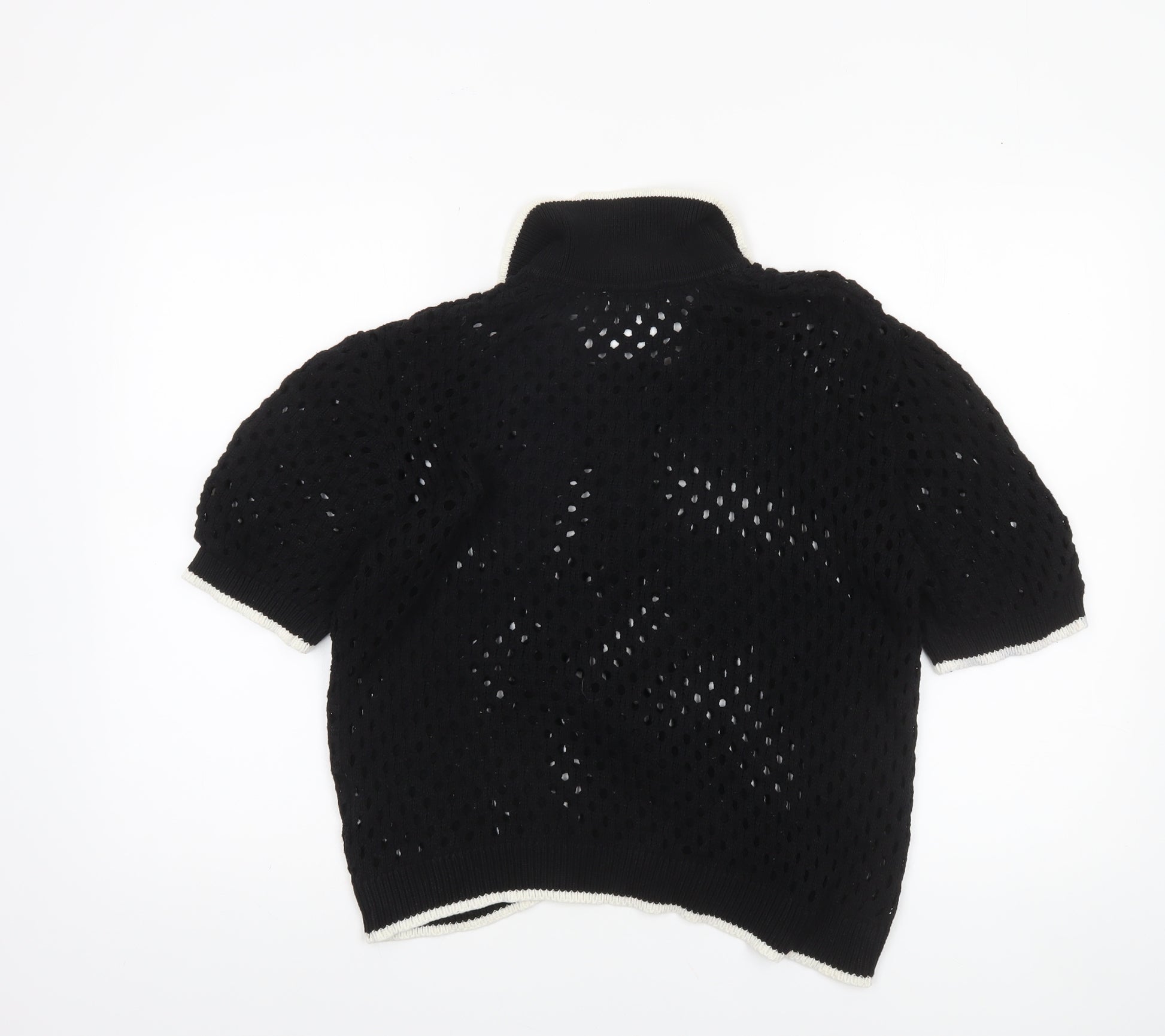 Women's Black Open Knit Collared Henley Jumper L