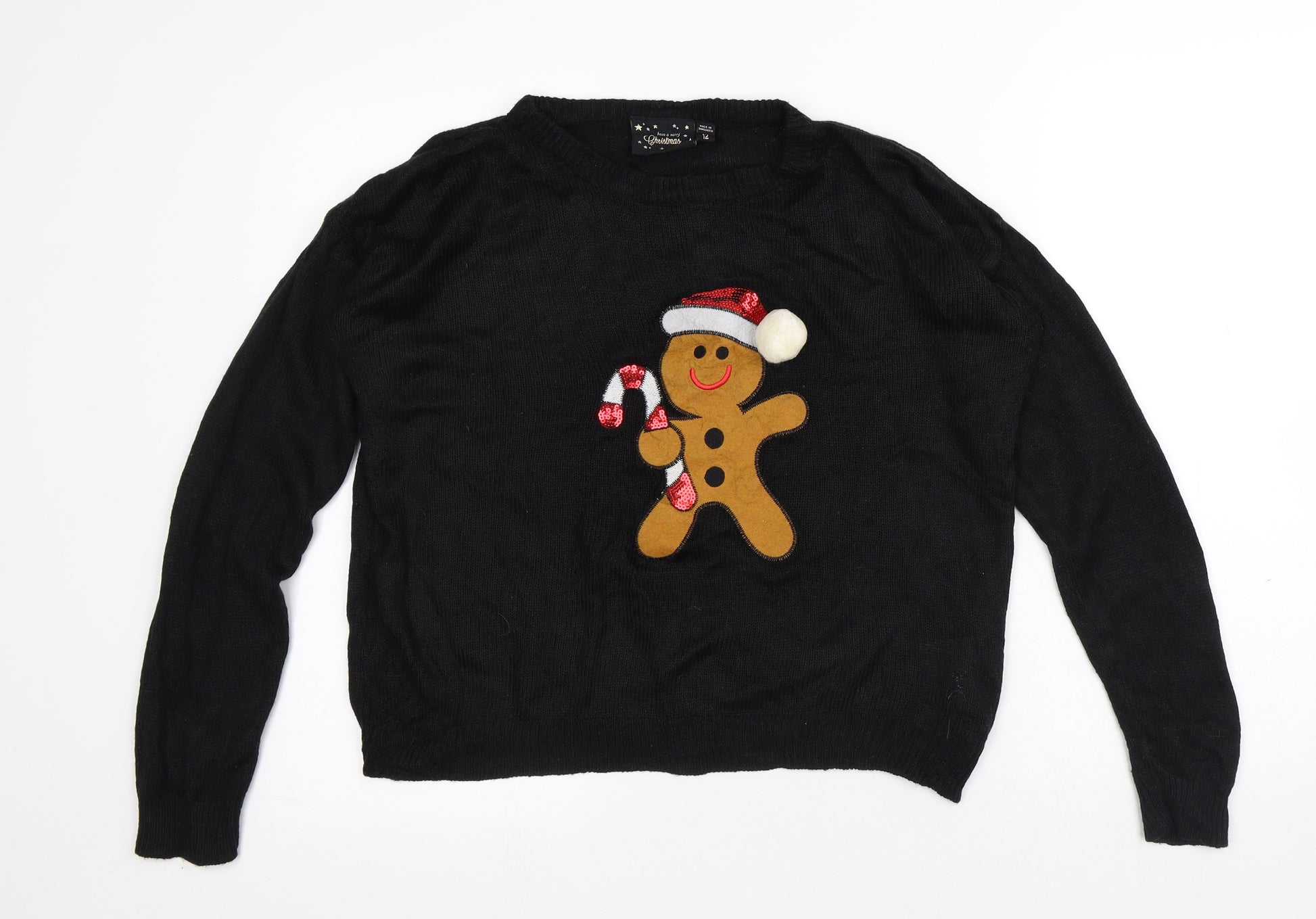Womens Black Round Neck Acrylic Pullover Jumper Size 12 - Gingerbread Man