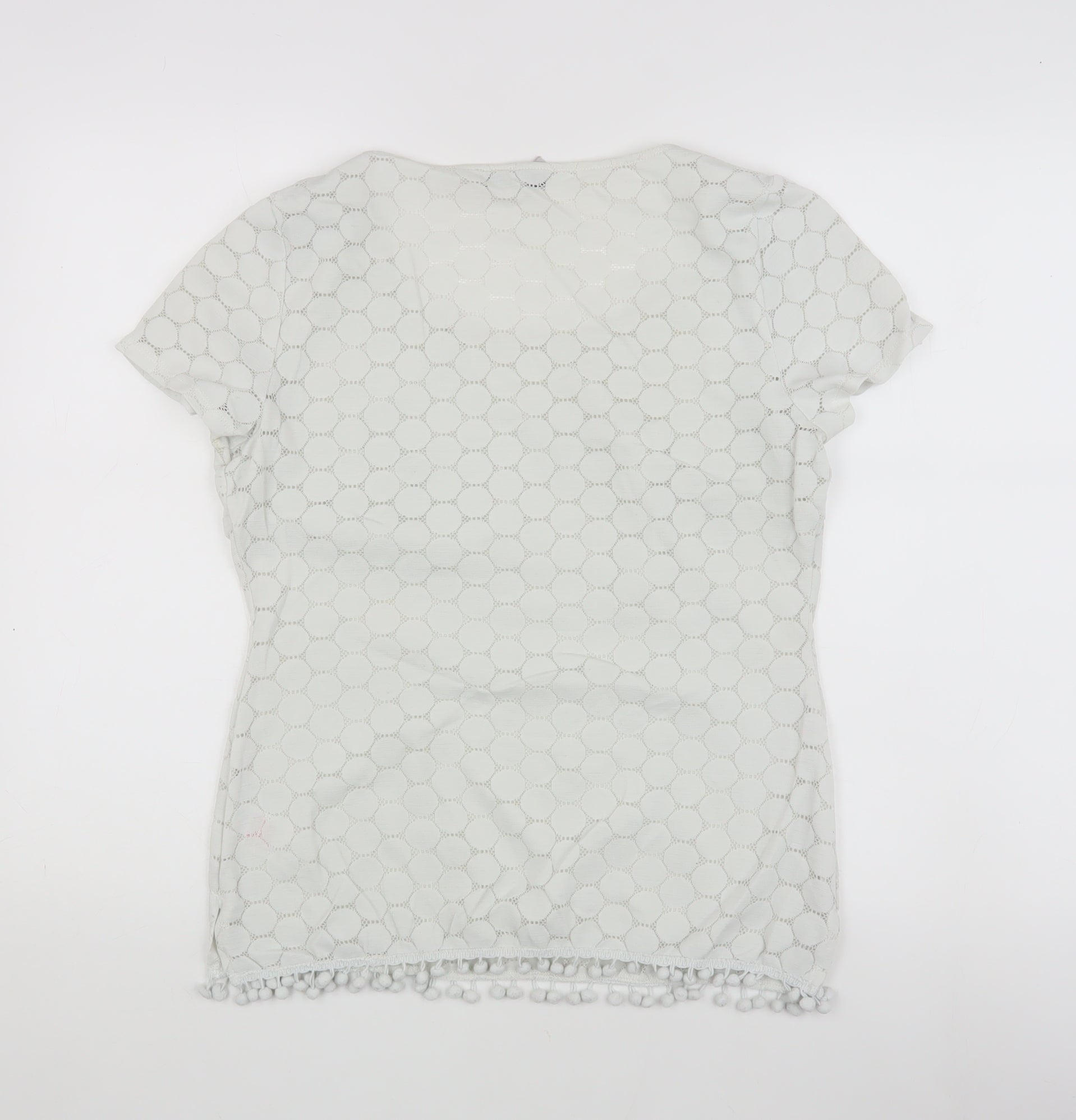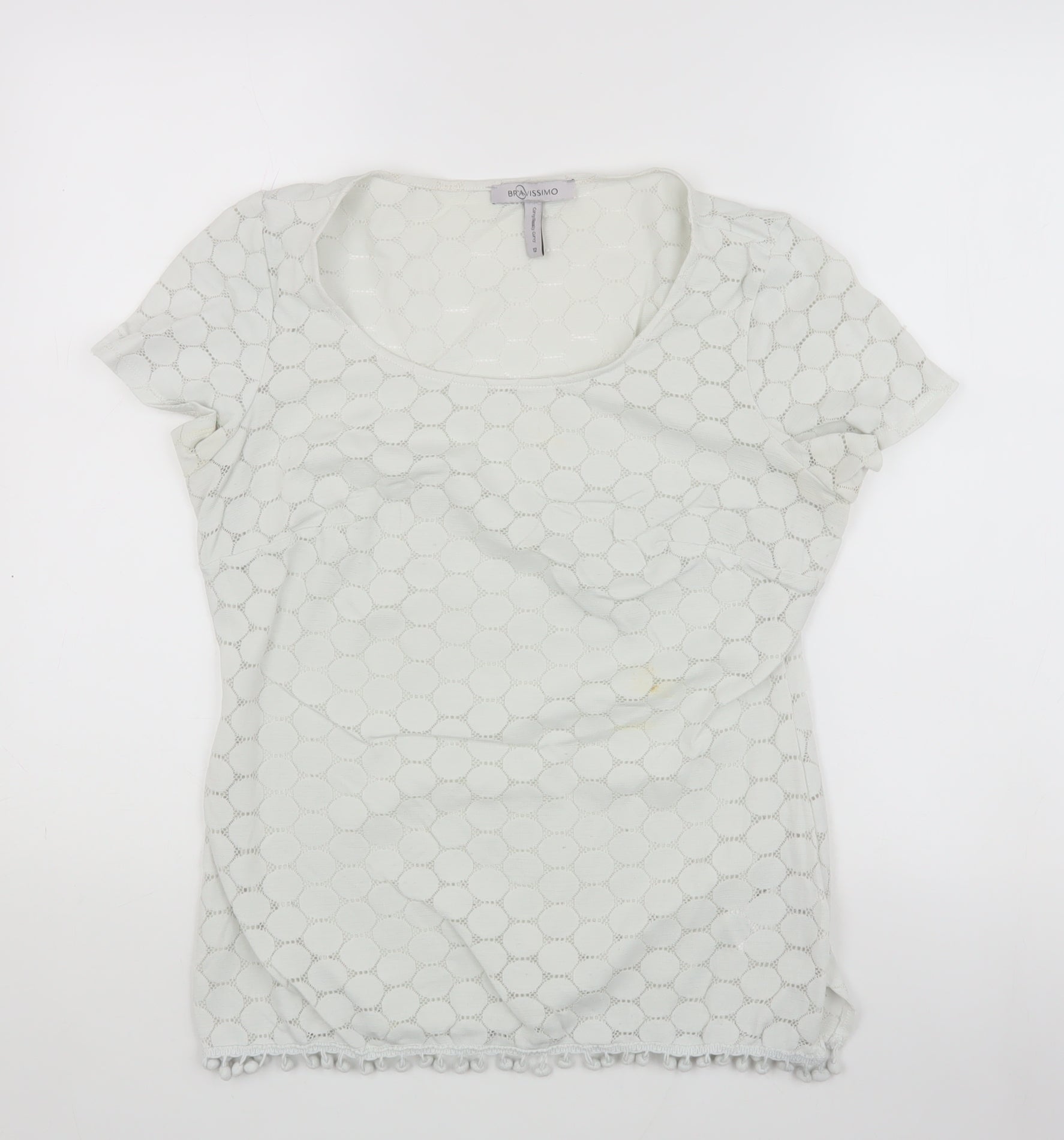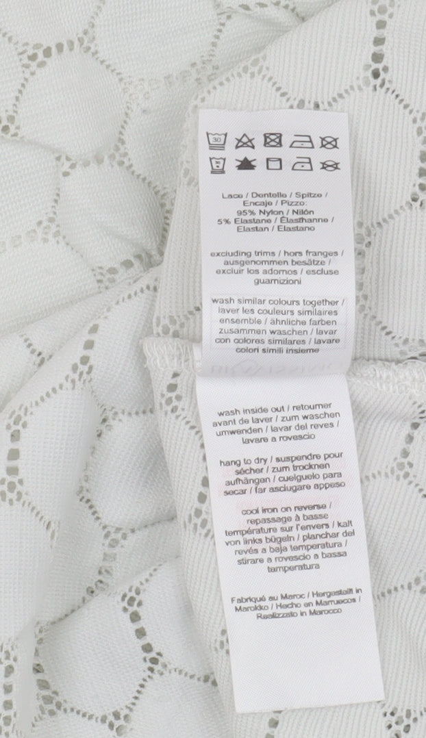 Elevate your wardrobe with this elegant Bravissimo lace t-shirt, crafted for the modern woman who appreciates style and comfort. Designed in a pristine white hue, this top is perfect for casual outings or a relaxed day at work. The regular fit gently contours to your body, providing an effortlessly chic look. Made from a high-quality blend of 95% nylon and 5% elastane, this top ensures both durability and stretch, making it an excellent choice for daily wear. The intricate lace fabric adds a touch of sophistication, while the scoop neckline and short sleeves offer a classic appeal. Easy to care for, this t-shirt is machine washable, ensuring it remains a staple in your closet. Its versatile design makes it suitable for pairing with a variety of bottoms, from jeans to skirts, allowing you to create a multitude of outfits. Please note that there are light stains on the front, which is reflected in the pricing. Despite this, the top retains its charm and is sure to become a favourite piece in your collection. Don't miss the chance to own this beautiful and versatile t-shirt from Bravissimo.