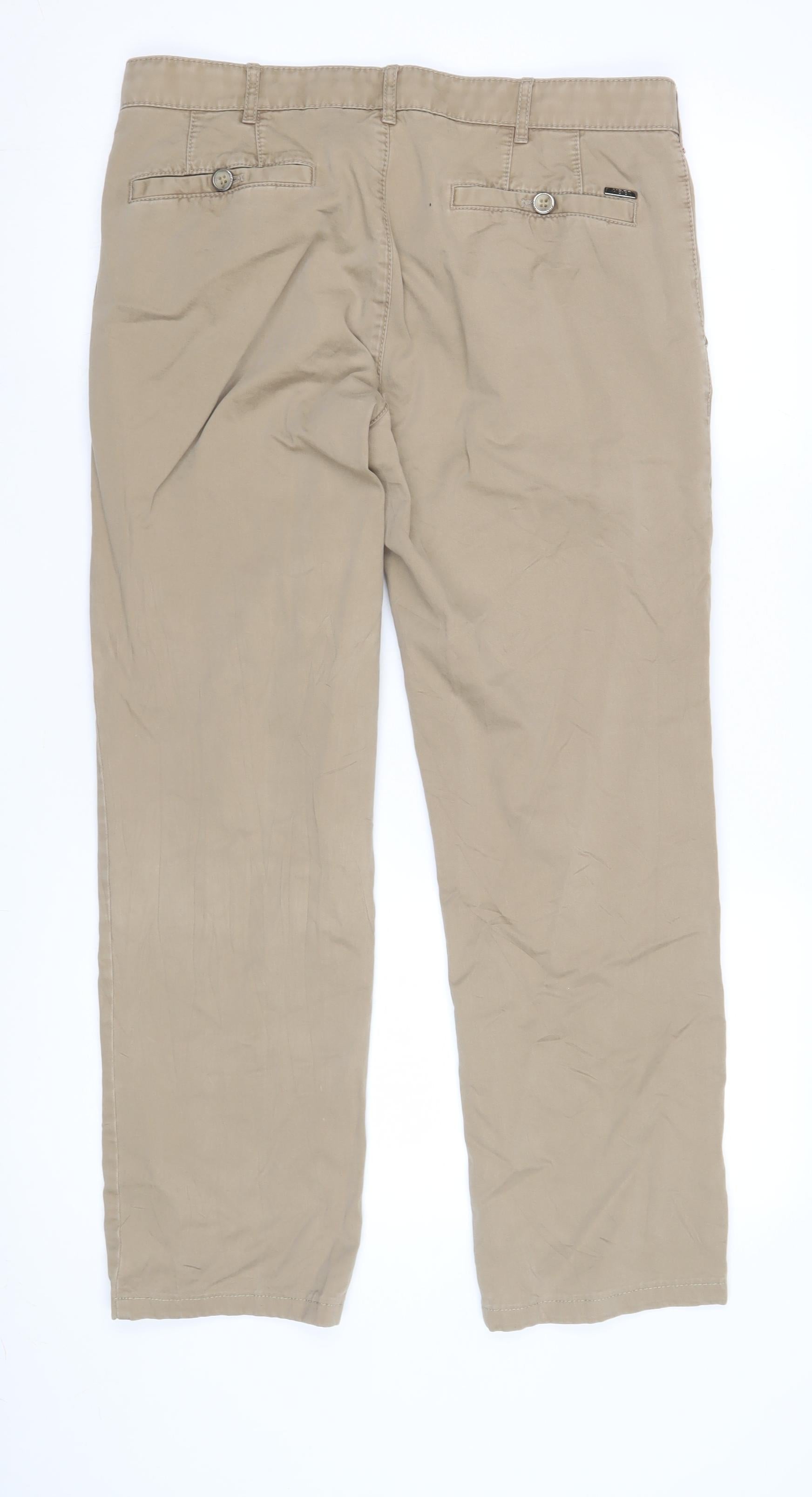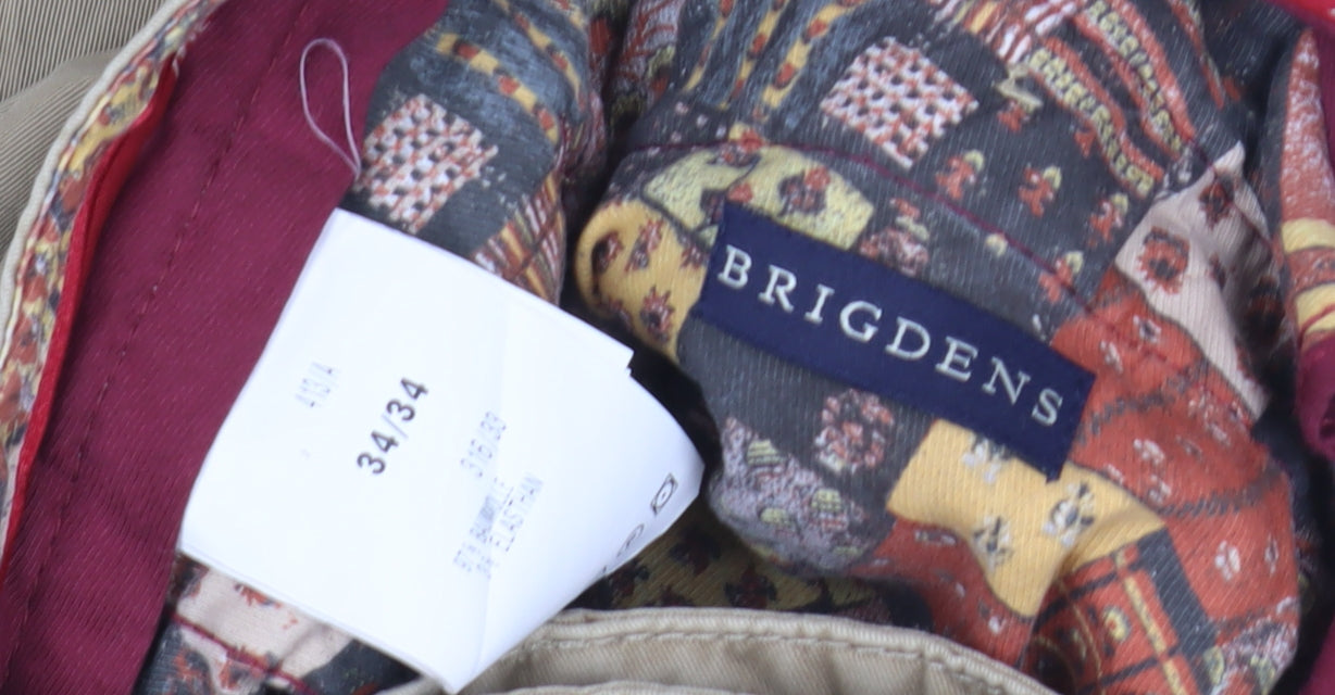 Explore comfort and style with these beige Brigdens chinos for men. Made from 100% cotton, these trousers offer a smooth, breathable feel, perfect for casual outings in spring and summer. With a regular fit, these chinos provide ample flexibility while maintaining a tidy, structured look. The flat front and straight leg design ensure a timeless silhouette suitable for various occasions. Equipped with a button and zip closure, these chinos ensure secure wear, while the slash pockets add practicality for everyday use. In excellent condition with minimal signs of wear, these trousers are machine washable, offering easy care and maintenance. Elevate your wardrobe with these versatile chinos, ideal for casual outings or relaxed office settings.
