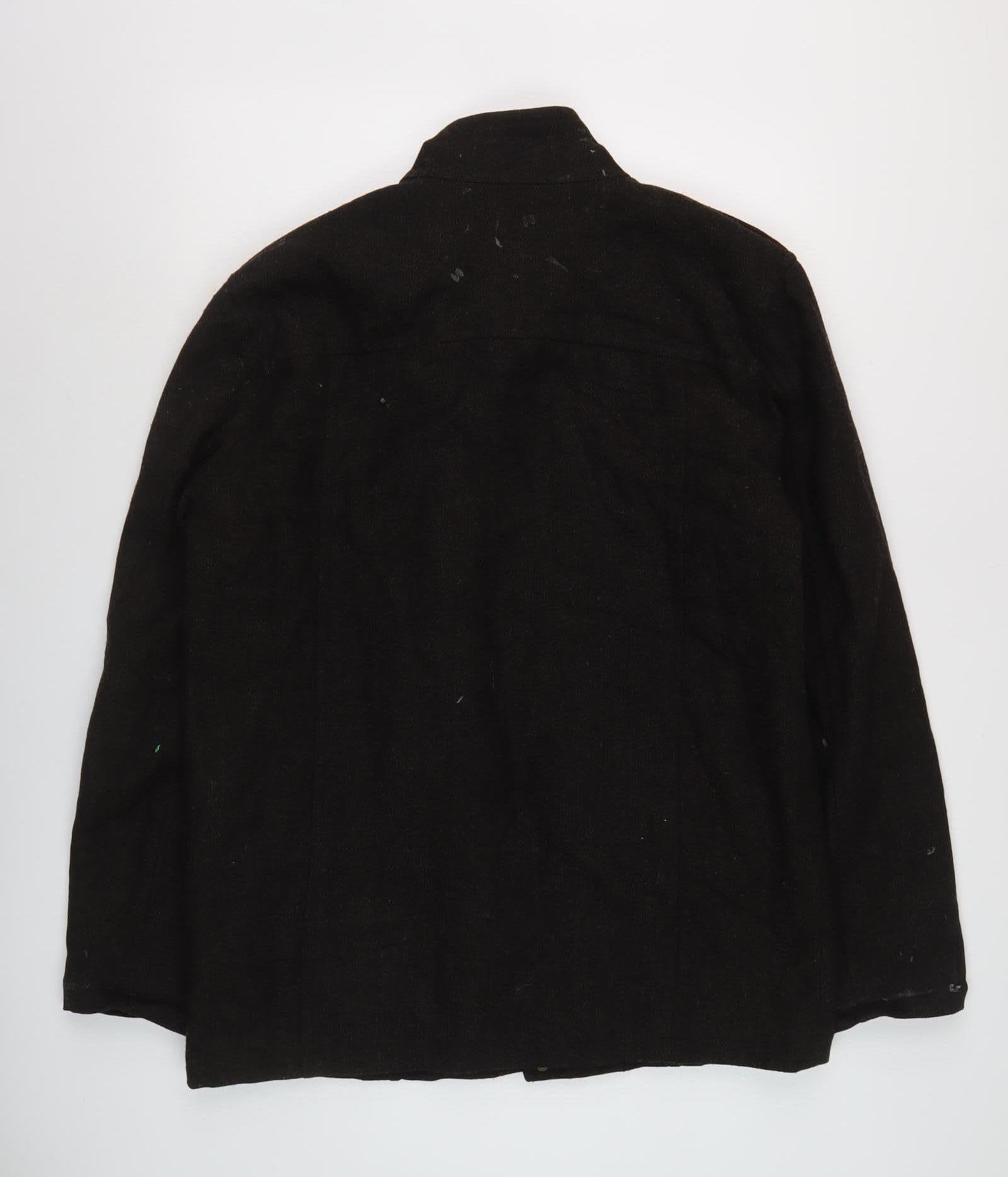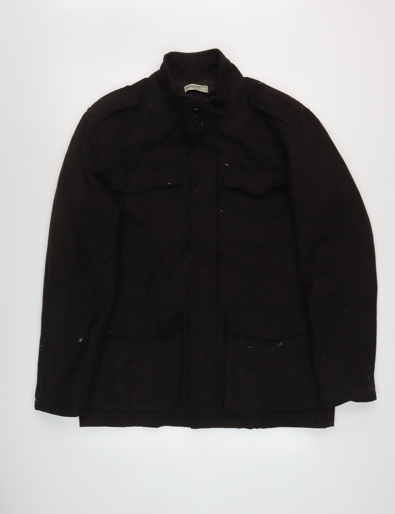 Elevate your outerwear collection with this Brooker Men's Black Wool Military Jacket. Crafted from premium wool, this sophisticated mid-length jacket offers both style and comfort. Designed for the modern man, the jacket features a stand-up collar and button closure, ensuring an elegant look for various casual occasions. The black colour gives it a versatile appeal, perfectly complementing diverse outfits. With practical pockets and a polyester lining, this jacket is an excellent piece for keeping warm during autumn and winter. It exhibits minor signs of wear, but its classic military style and durable construction make it a fantastic buy. Head out in style and warmth while showcasing a refined taste in fashion with this Brooker Jacket.