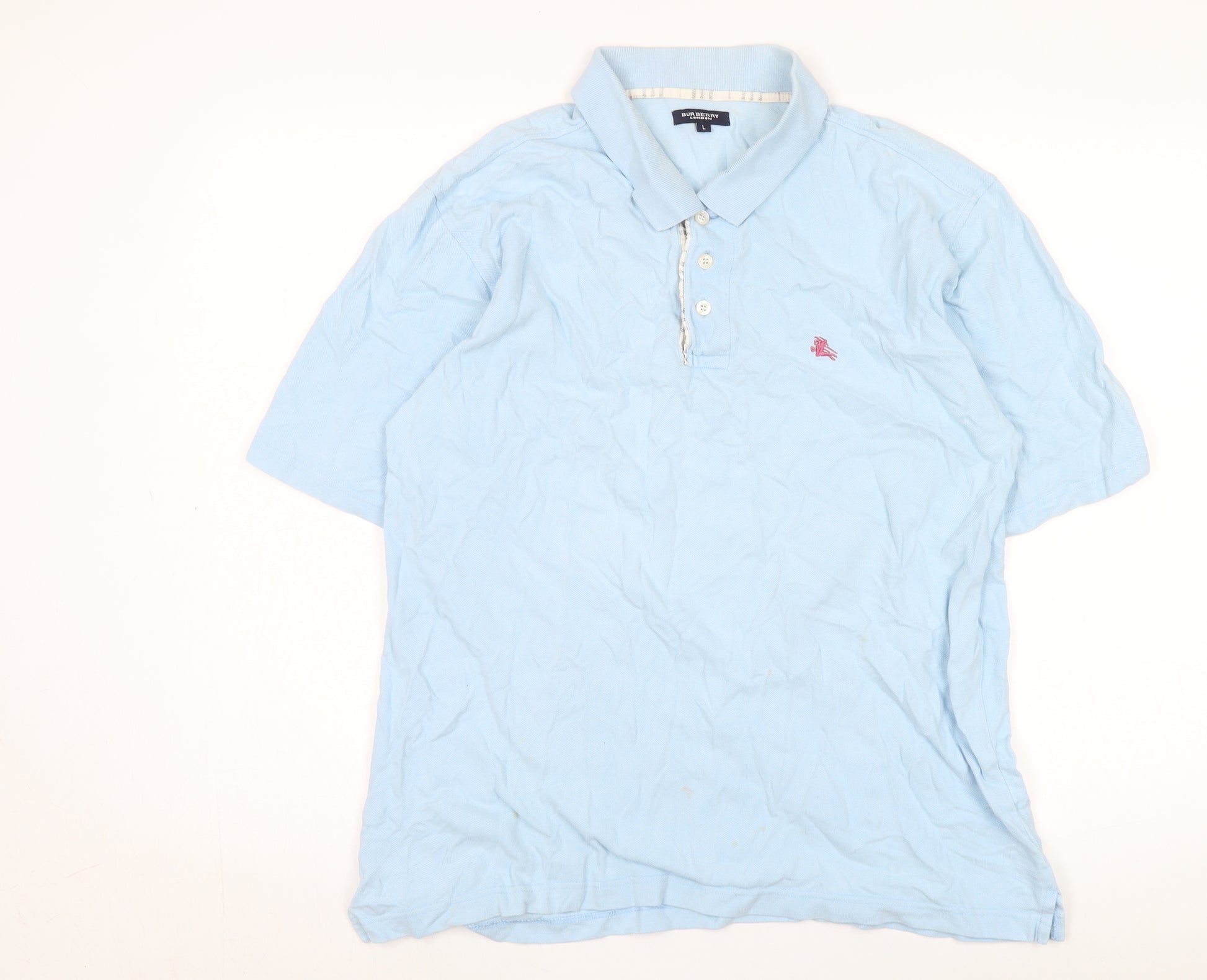 Discover timeless fashion with this Burberry Men's Polo Shirt in striking blue. Crafted from 100% cotton, it offers maximum comfort and breathability, perfect for warm summer days. This polo is versatile, ideal for casual outings or laid-back social gatherings. The classic collared neckline with a button-down style adds elegance, while the iconic Burberry logo accents showcase superior quality and craftsmanship. With its regular fit and solid pattern, this polo complements any wardrobe effortlessly. Despite minor wrinkling and a faint mark, it remains in excellent condition, ready to elevate your casual look with a touch of luxury. Easy to care for with a machine washable design, this polo is both practical and stylish. Grab this Burberry gem today and infuse your collection with sophistication!