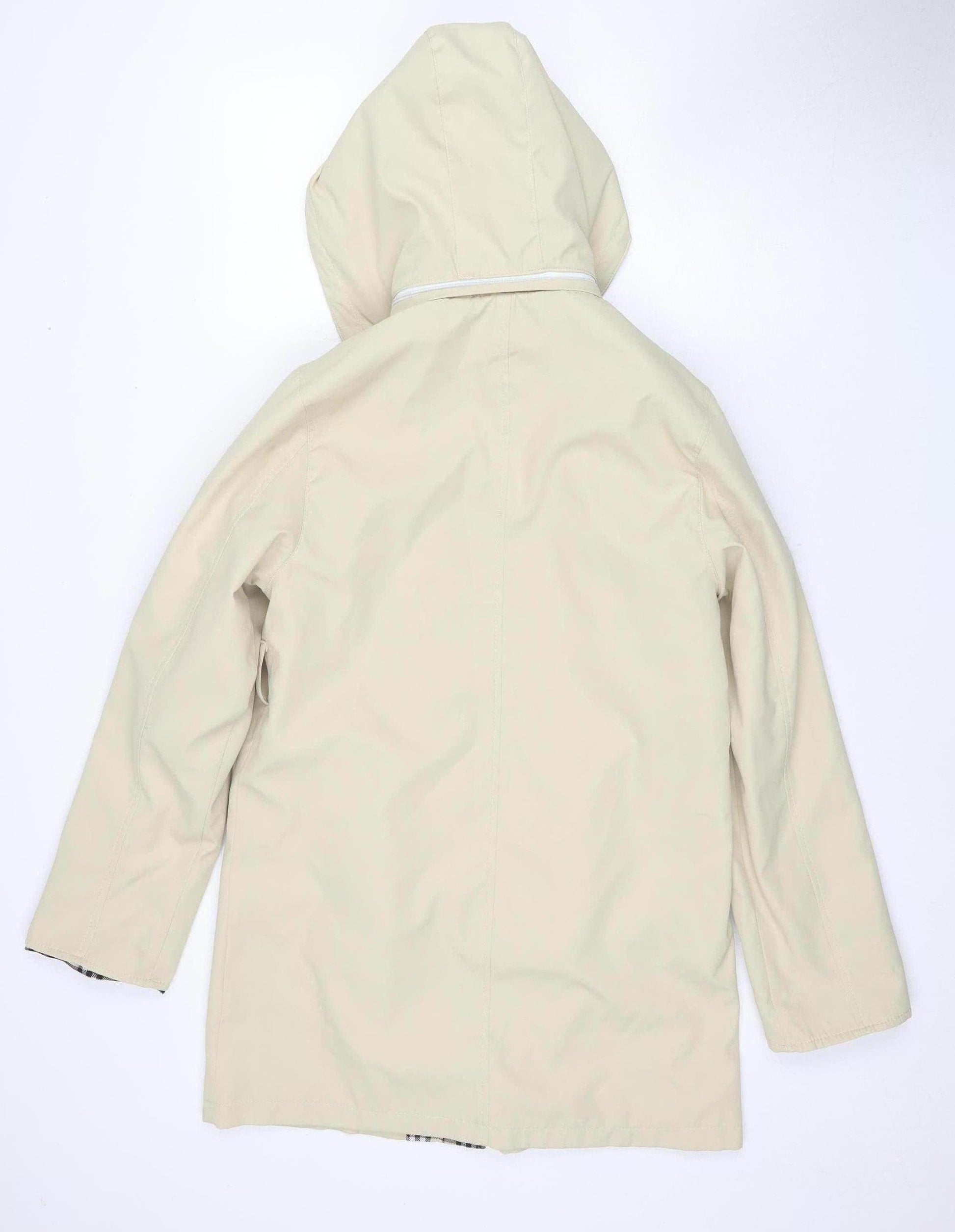 Discover timeless elegance with this beige Burberry women's rain coat, designed for both style and practicality. Crafted from a durable cotton blend, it offers a mid-length silhouette that's perfect for those crisp autumn and spring days. The coat features a classic hooded design and practical elements such as a button and zip closure, ensuring you stay protected from the elements. The wool lining provides comfort and warmth, making it an ideal choice for casual outings. Decorative buttons add a touch of sophistication, while the pockets offer convenient storage. Wear this versatile coat over any outfit to elevate your look effortlessly.
