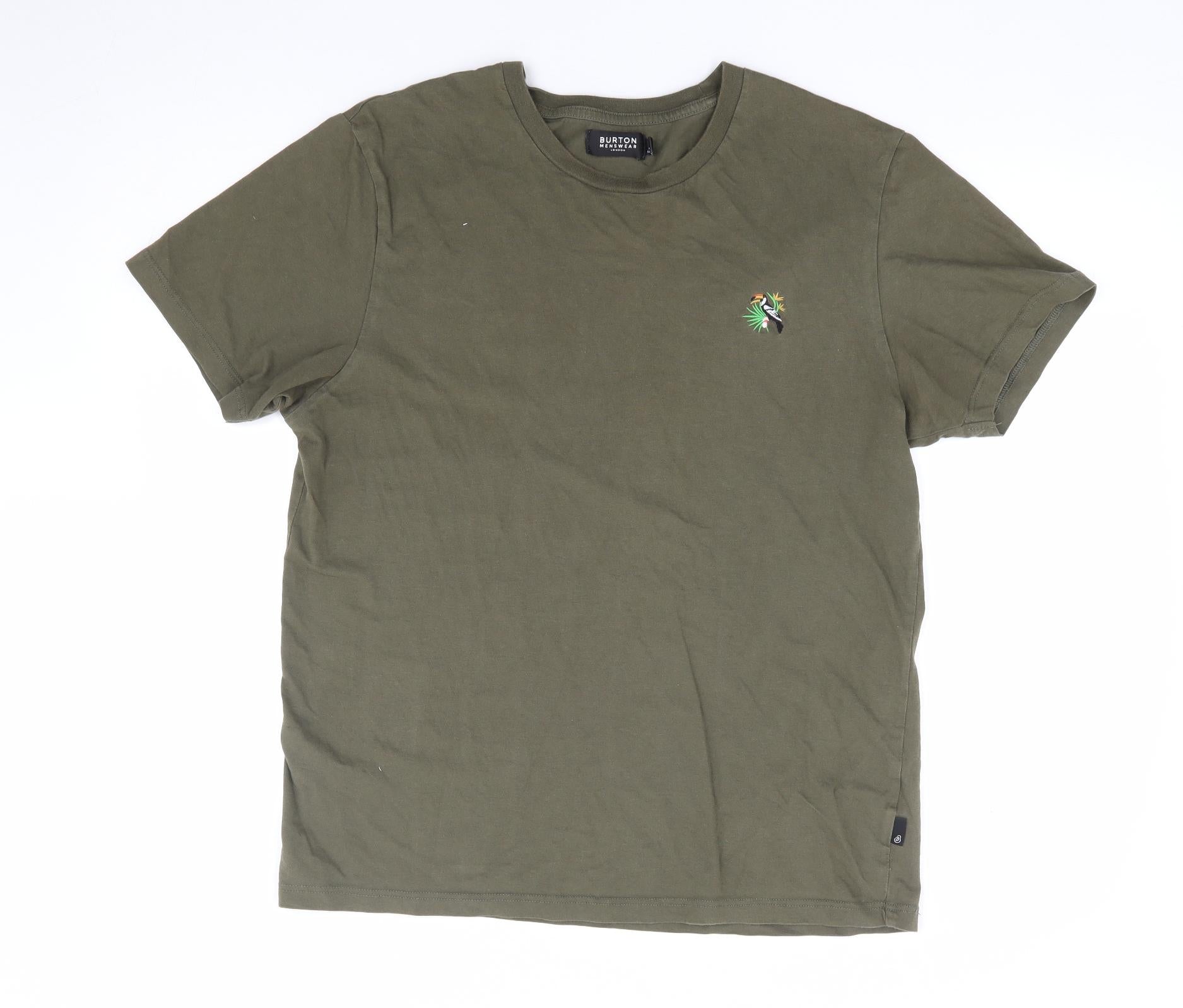 Mens Green Cotton T-Shirt Size M Crew Neck - Bird