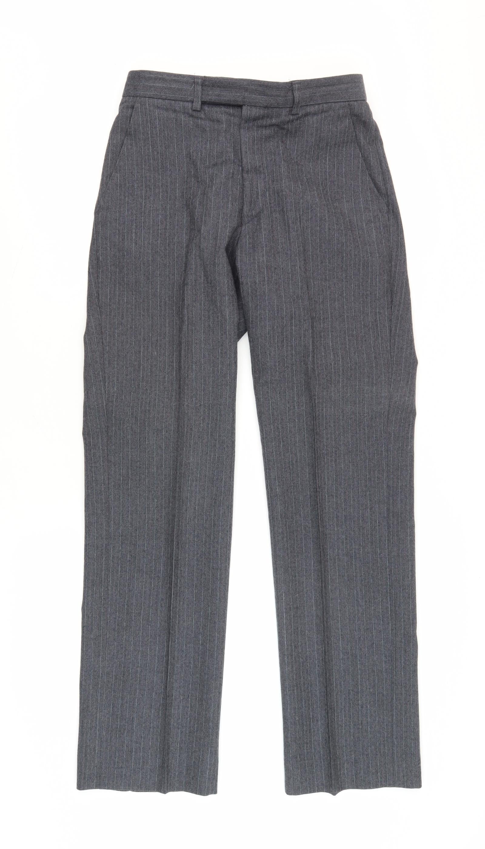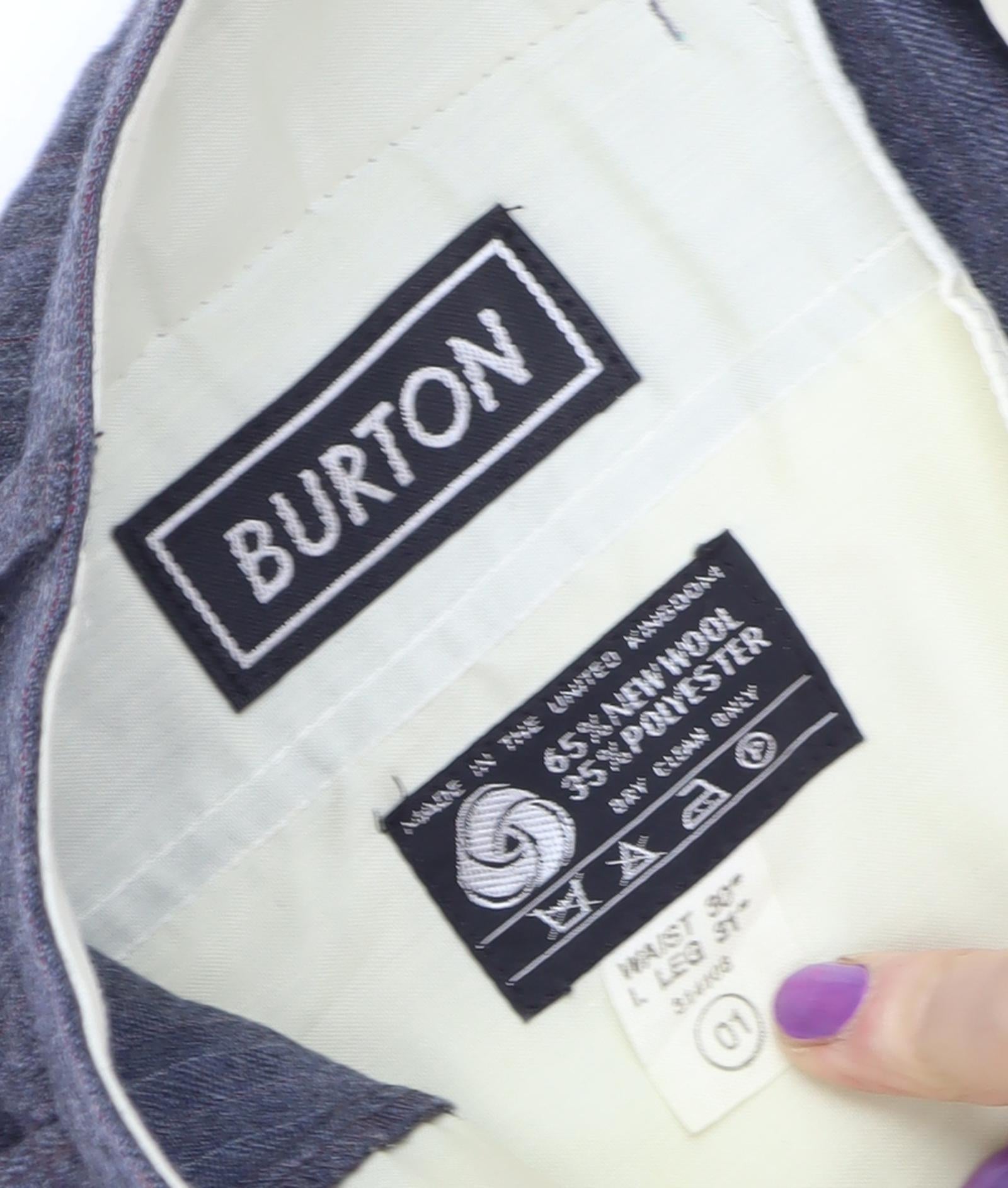 Elevate your wardrobe with these sophisticated men's striped grey suit trousers from Burton. Expertly crafted from a fine blend of 65% wool and 35% polyester, these trousers offer a sleek and refined look perfect for formal settings or business environments. The subtle pinstripe pattern lends a classic touch that is sure to impress. Designed to fit comfortably, these trousers boast a waist size of 34 inches and an inside leg measurement of 31 inches, ensuring a tailored fit for the modern gentleman. Suitable for any season, this versatile piece can seamlessly complement various outfits. Pair with a crisp shirt and blazer for an effortlessly polished appearance. With their dry clean only care instruction, maintaining the pristine condition of these trousers is straightforward. An ideal addition to any discerning man's collection, these trousers promise to become a staple for office wear, interviews, weddings, or other formal occasions.