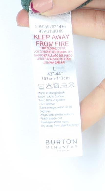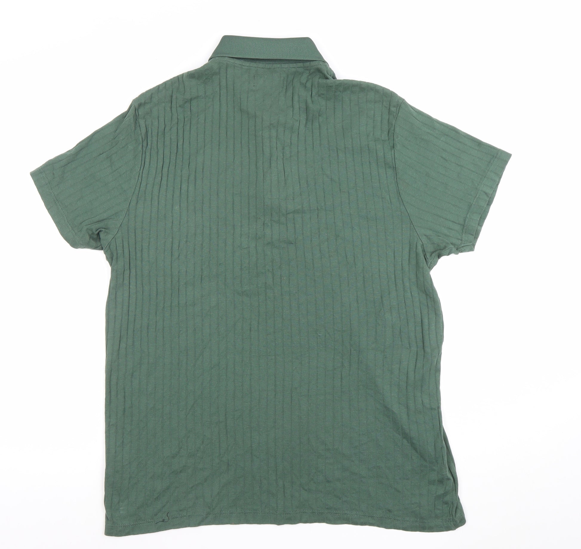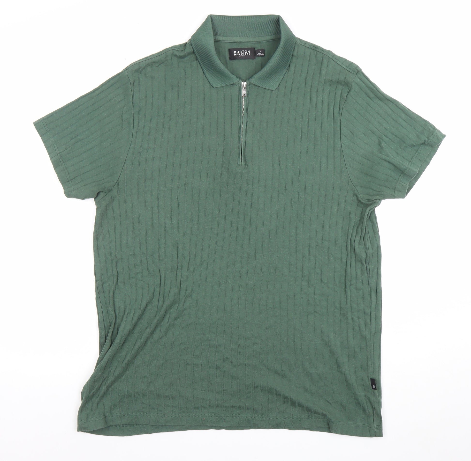 This Burton Menswear green short sleeve polo shirt offers a modern yet timeless look, ideal for any casual wardrobe. Crafted from a comfortable and breathable cotton-polyester blend, this polo combines soft texture with durable wearability — perfect for everyday comfort. The ribbed texture detail throughout adds subtle visual interest and structure, keeping the classic polo silhouette refreshed and stylish. Featuring a smart collared neckline and a sleek 1/4 zip fastening, it delivers a modern twist on the traditional button-up style. The solid green colour provides versatile styling options, pairing effortlessly with jeans, chinos, or shorts for any casual outing. Lightweight and easy to care for, this piece ensures practicality with its machine washable fabric. Designed with a regular fit, it offers a comfortable drape without feeling too tight or loose. The short sleeves make it ideal for warmer months, while its breathable construction keeps you cool throughout the day. Whether for a relaxed weekend, casual office setting, or an outdoor summer event, this Burton Menswear polo will keep you looking sharp and feeling confident. Finished with a zip accent for extra flair, it strikes the perfect balance between casual comfort and contemporary sophistication. In very good pre-owned condition with slight creasing from storage, this polo remains ready to wear and an excellent addition to any men’s wardrobe seeking a classic yet up-to-date piece. A stylish and versatile choice for men who value quality basics with subtle character.