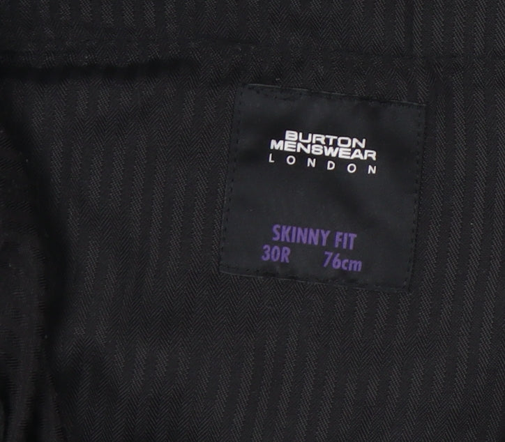 These elegant skinny fit trousers from Burton Menswear London offer an ideal combination of style and comfort for the modern man. Crafted with precision, they feature a sleek grey colour that effortlessly complements a wide range of shirts and blazers. The trousers boast a functional design with a traditional flat front, ensuring a streamlined silhouette that is perfect for both casual outings and more formal gatherings.Made from a high-quality blend of 68% polyester, 29% viscose, and 3% elastane, these trousers promise durability while providing a slight stretch for ease of movement. This composition not only guarantees long-lasting wear but also offers machine washability for easy care, allowing you to maintain their pristine condition with minimal effort.The trousers feature classic accents such as button closures, ensuring a secure fit, and are equipped with practical slash pockets, providing ample space for daily essentials. With a comfortable mid-rise, these trousers hug your frame perfectly, enhancing your overall look.Whether you're dressing up for a business meeting or heading out for a casual evening, these trousers are versatile enough to fit any occasion. They come in a standard size 30R, with a 30-inch waist and inside leg measurement, perfect for a comfortable fit. The subtle patternless design adds a touch of simplicity and sophistication that suits any wardrobe.Don't miss out on adding these stylish skinny trousers to your collection—the small wear on the rear pocket is barely noticeable and does not detract from their overall quality. Priced affordably, they offer great value for a high-fashion piece. Elevate your style with these trousers from Burton Menswear today.