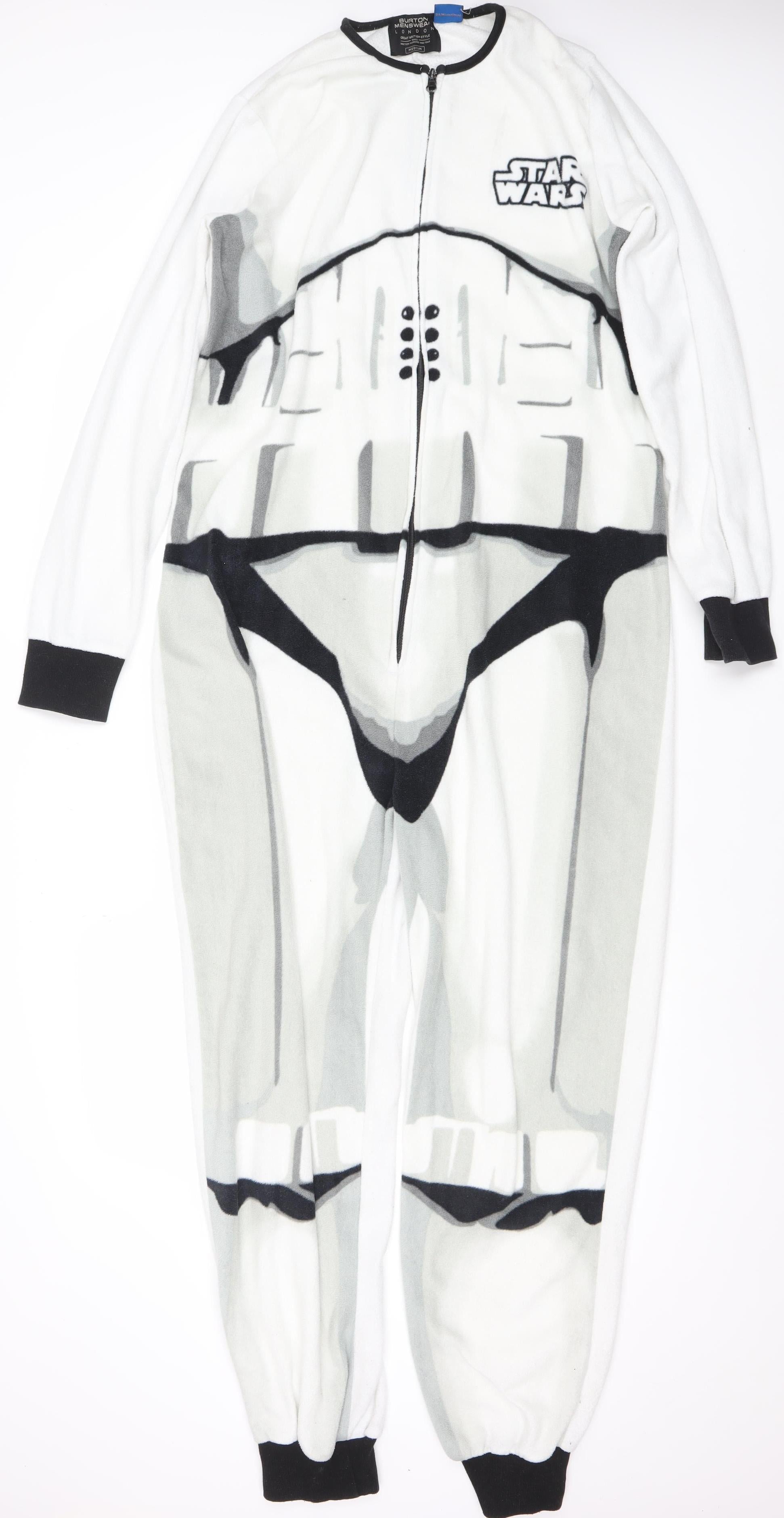 Step into the world of Star Wars comfort with this Burton Menswear London Stormtrooper fleece one piece. Designed for men who value both cosy relaxation and bold character style, this nightwear brings cinematic charm to your downtime. The eye-catching graphic print captures the iconic Stormtrooper armour in subtle shades of white, grey, and black, finished with the official Star Wars logo embroidered on the chest. Constructed from soft 100% polyester fleece, it offers exceptional warmth and lightweight comfort during colder evenings. The zip-up closure makes it easy to slip on and off, while elasticated cuffs at the wrists and ankles ensure a snug fit to lock in warmth. Perfect for lounging or sleeping, this onesie is ideal for any Star Wars enthusiast seeking both fun and practicality. Tailored in a medium size for a regular fit, it caters perfectly to men or unisex adults who enjoy novelty nightwear. Machine washable for easy upkeep, this winter essential brings together pop culture nostalgia and modern British style from Burton Menswear London. Whether you’re curling up for a movie marathon or simply relaxing at home, this Star Wars Stormtrooper fleece one piece offers outstanding comfort and standout character. With its excellent pre-loved condition and no visible defects, it’s the perfect combination of value and personality — the ultimate gift for a Star Wars fan or an eye-catching addition to your nightwear collection.