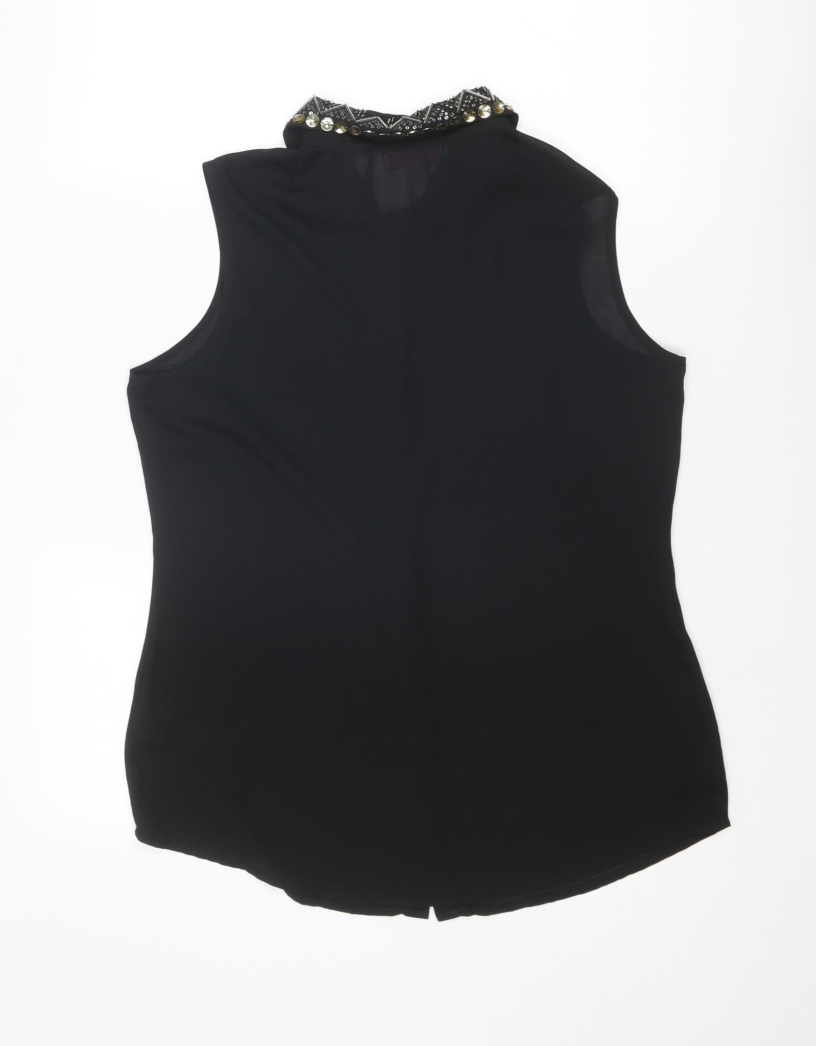 Womens Black Polyester Basic Button-Up Size 14 Collared - Embellished Collar