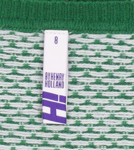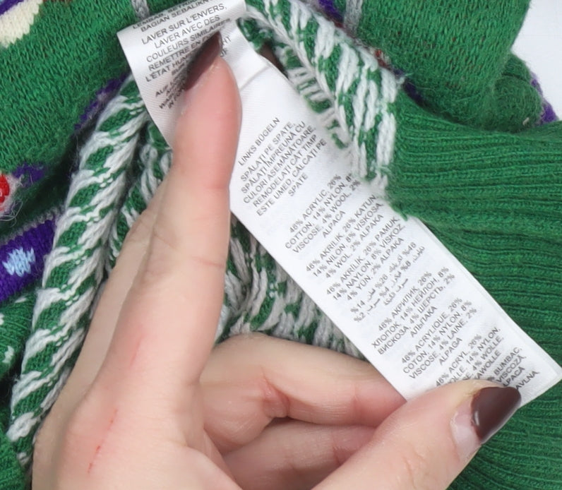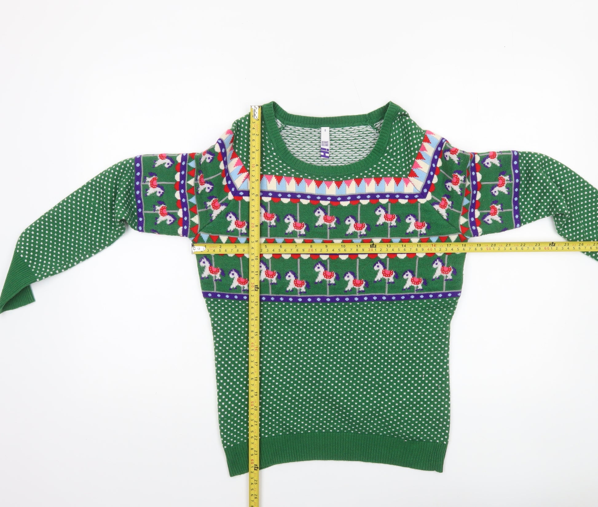 Bring festive charm to your winter wardrobe with this vibrant green Christmas jumper by Henry Holland. Designed for women in a comfortable UK size 8, this pullover offers a fun and playful look ideal for casual holiday events or seasonal parties. The striking Fair Isle pattern featuring carousel horses, bunting, and colourful geometric motifs gives this jumper a unique and cheerful vibe that stands out during the holiday season. Crafted from a soft knit blend of acrylic, cotton, nylon, viscose, wool, and alpaca, it ensures a cosy yet breathable feel that’s perfect for cooler autumn and winter days. The crew neckline and long sleeves provide a flattering, classic fit, while the ribbed neckline, cuffs, and hem help retain shape and comfort during wear. The snug but flexible stretch fabric makes it both comfortable and practical for daily use. Ideal for pairing with jeans or a skirt, this jumper captures the spirit of the season with style and personality. Its lightweight yet warm structure allows for layering without bulk, making it suitable for both indoor festivities and outdoor gatherings. Conditioned in excellent pre-owned state, it shows minimal signs of prior wear with its knit and colour remaining crisp and bright. Whether worn as a statement piece for a festive celebration or simply for adding a pop of joy to your winter wardrobe, this By Henry Holland jumper is a must-have. Celebrate the holidays in cosy comfort and unmistakable style with this charming, conversation-starting piece. A delightful addition for anyone who loves playful fashion with a designer touch—perfect for Christmas jumper days or as a thoughtful gift for someone special.