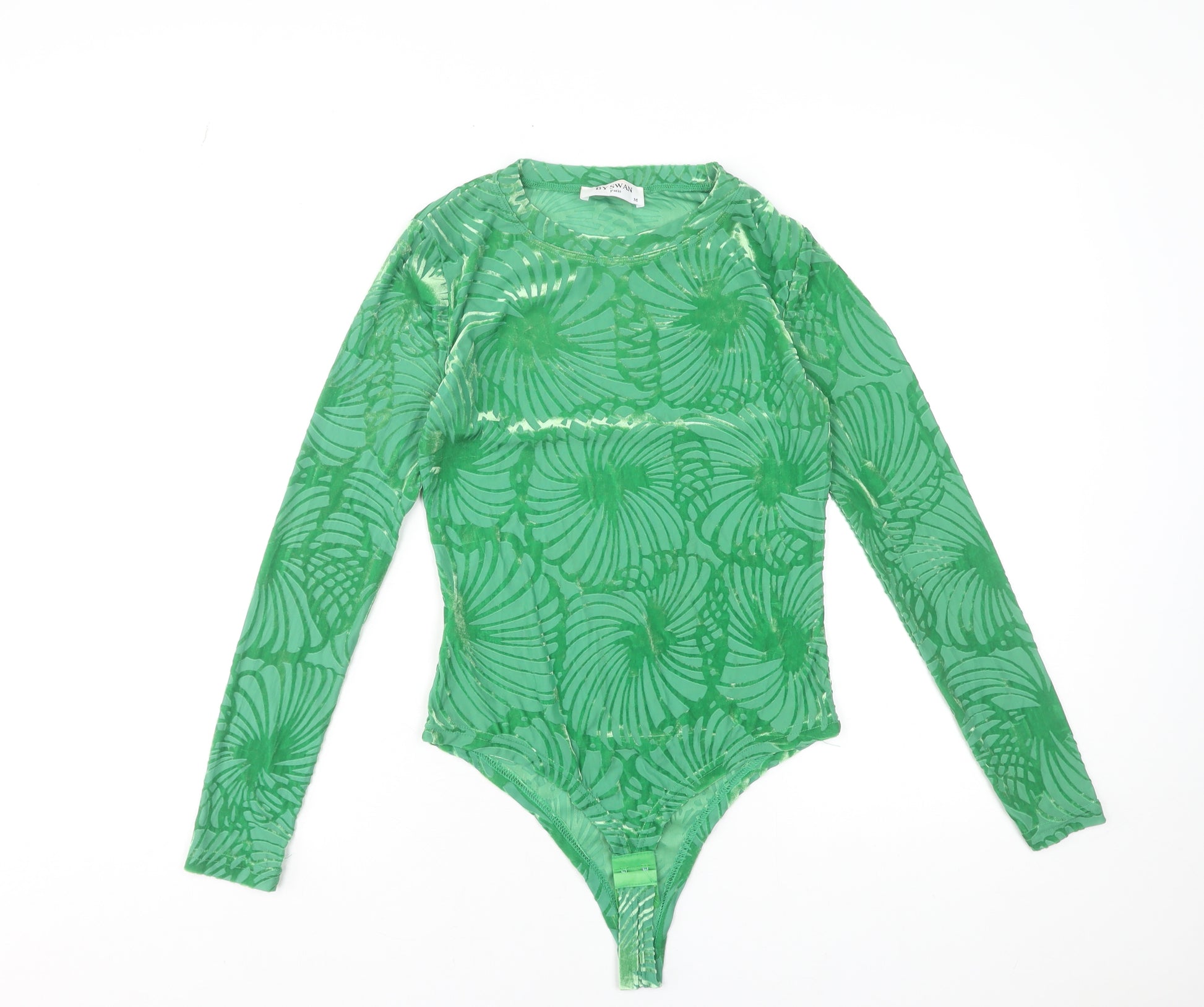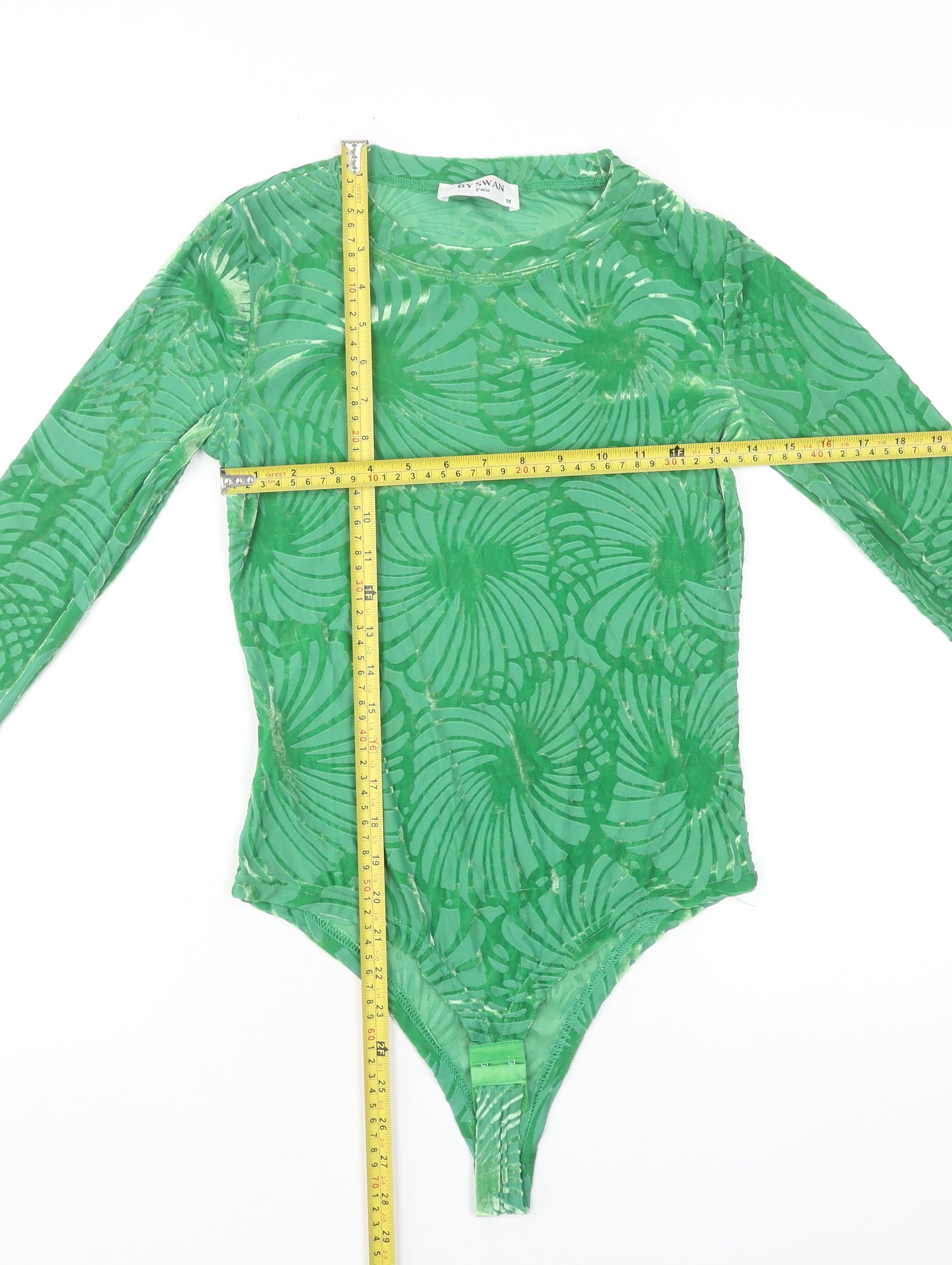 Add a touch of Parisian flair to your wardrobe with this beautiful green bodysuit from By Swan Paris. Designed for women who love statement pieces, this elegant one-piece bodysuit features a vibrant green floral mesh pattern that perfectly balances sophistication and playful charm. Crafted from a soft and breathable blend of viscose, polyester, and elastane, it offers just the right amount of stretch for a flattering, comfortable fit. The long sleeves and round neckline lend it a classic silhouette, while the semi-sheer design makes it ideal for layering under high-waisted trousers, skirts, or shorts. Whether styled for a night out, a dinner date, or a festive party, this bodysuit creates an effortlessly chic look that transitions seamlessly from day to evening. Its lightweight and sheer material make it comfortable for warmer seasons such as spring and summer, while the subtle shimmer in its mesh texture can take your autumn layering to the next level. Finished with a practical snap fastening at the crotch for ease of wear, this piece combines contemporary style with versatility. Conditioned in excellent pre-loved state, it shows minimal signs of previous use and remains in clean, wearable condition. Pair it with heels and statement jewellery for a standout night-out look or tone it down with jeans for a casual chic vibe. By Swan Paris delivers quality and trendy appeal with this vibrant, fashion-forward bodysuit – a must-have for any modern wardrobe that values elegance, comfort, and style.