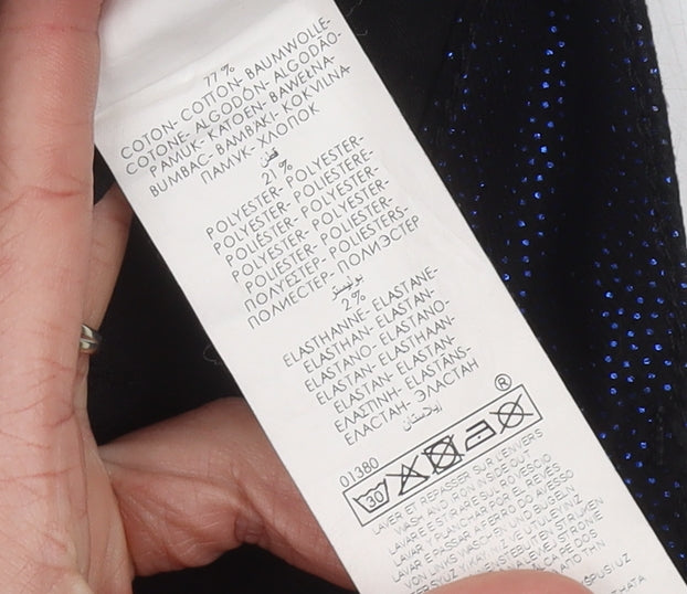 Step out in style with these striking Cache Cache women’s trousers, perfect for adding a bold yet sophisticated twist to your wardrobe. Designed in a captivating deep blue shade with an eye-catching geometric pattern, these trousers are ideal for those who love to make a statement. The slim, skinny fit flatters the figure whilst offering a modern silhouette suitable for both casual and evening occasions. Crafted from a quality blend of 77% cotton, 21% polyester, and 2% elastane, the fabric provides comfort, durability, and just the right amount of stretch for ease of movement throughout the day. These trousers feature a mid-rise waist for a balanced fit, secured with a classic button and zip fastening. Practical side and back pockets add to their versatile design, making them a great choice for everyday wear as well as special outings. Perfect for autumn, spring and cooler winter evenings, they can be styled effortlessly with blouses, knits, or tailored jackets. Their chic and contemporary design makes them suitable for casual meetups, parties, or even smart-casual settings, where their blend of comfort and elegance shines. Garment care is simple too, with a machine washable fabric that ensures easy maintenance. Although pre-loved, they remain in excellent condition with only light signs of wear and no visible flaws. At an affordable price, these Cache Cache trousers are a fantastic addition to any modern woman’s wardrobe, offering both on-trend style and practicality. Whether paired with heels for an evening out or trainers for a relaxed look, they are a versatile staple you’ll find yourself reaching for again and again. Don’t miss the chance to own these fashionable slim-fit trousers, ready to elevate your everyday looks with confidence and charm.