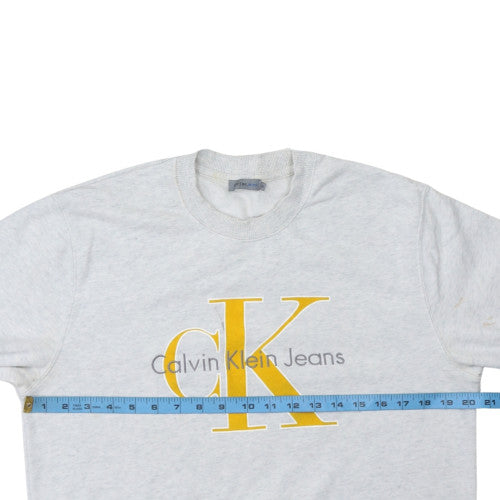 Add a touch of classic designer style to your casual wardrobe with this Calvin Klein Jeans women's grey pullover sweatshirt. Designed with an unmistakable CK logo print in striking yellow and grey across the front, this sweatshirt embodies effortless sophistication and comfort. Constructed from a soft blend of cotton and polyester, it offers warmth and breathability – ideal for layering throughout the seasons. The crew neckline, ribbed cuffs, and hem give it a timeless silhouette that enhances its everyday wearability. The relaxed fit ensures easy styling with jeans, leggings, or joggers for a chic off-duty look. Perfect for the cooler months, this sweatshirt balances a cosy feel with a fashionable edge, staying true to Calvin Klein’s minimalist yet distinctive aesthetic. Slight marks on the fabric indicate light wear, adding a vintage charm to this preloved piece. Whether you’re running errands, lounging at home, or stepping out for a casual outing, this piece delivers iconic streetwear appeal with premium comfort. Don’t miss the chance to own an authentic Calvin Klein Jeans sweatshirt that combines quality craftsmanship with understated designer detail.