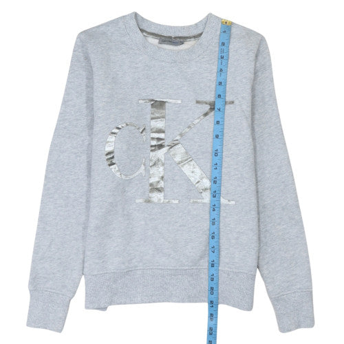 Elevate your casual wardrobe with this stylish Calvin Klein Jeans women’s sweatshirt, designed for timeless comfort and effortless fashion. Crafted from a high-quality cotton blend material, this light grey pullover features the iconic metallic ‘CK’ logo across the front, making it instantly recognisable and chic. Perfect for layering or wearing on its own, the sweatshirt offers a balance of soft warmth and breathability, suitable for all seasons.The relaxed, regular fit ensures comfort without compromising style, while the ribbed hem, neckline, and cuffs give a flattering silhouette. Designed with long sleeves and a classic crew neck, it’s versatile enough to pair with jeans, leggings, or joggers for that effortlessly cool, off-duty look. This sweatshirt offers a sleek and minimal aesthetic, ideal for everyday wear, travel, or casual outings.Made with a cotton and polyester composition, it provides durability and softness. The silver metallic logo adds a stylish accent without overpowering the design. Whether you're heading out for a weekend stroll, lounging at home, or meeting friends, this Calvin Klein Jeans sweatshirt brings a touch of designer sophistication to your outfit.Though pre-loved, it remains in excellent condition with minimal signs of wear, ensuring plenty of life left for its next stylish owner. Perfect for those who appreciate branded quality and modern simplicity, this sweatshirt embodies both comfort and understated luxury — a wardrobe essential not to be missed.