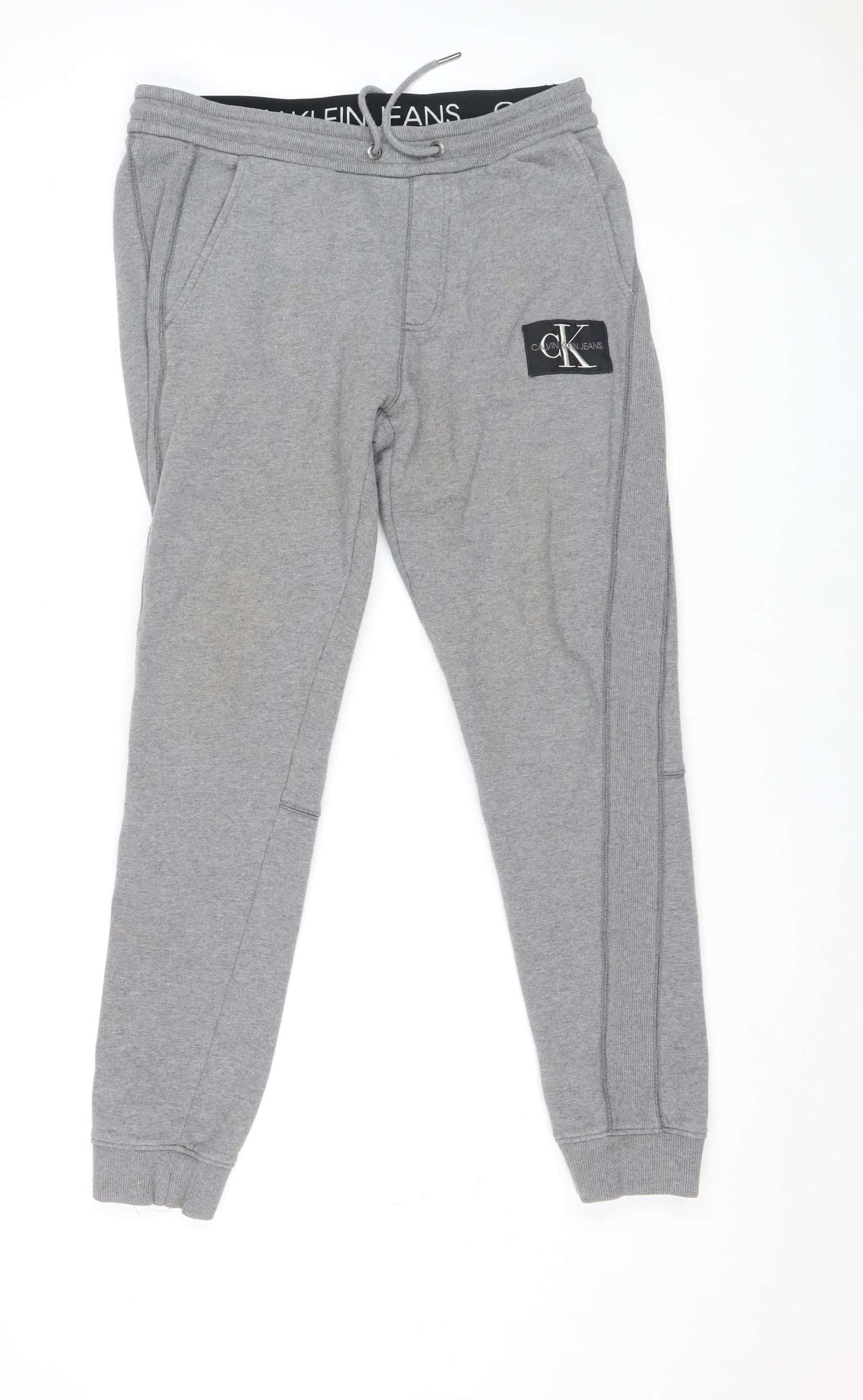 Step up your casual comfort with these Calvin Klein Men's Grey Jogger Sweatpants in size L. Designed with a modern tapered leg and regular fit, these joggers deliver effortless style and a premium feel ideal for lounging, training, or daily wear. Crafted from a soft jersey fabric blend of 80% cotton and 20% polyester, they provide breathable comfort while maintaining durability. The elasticated waistband with adjustable drawstring ensures a secure, customisable fit, and the multiple pockets offer practical storage. The minimalist grey tone is versatile, pairing easily with tees, hoodies, or trainers for a relaxed, refined look. Featuring the signature Calvin Klein branding on the waistband and logo patch, these joggers embody understated luxury and contemporary design. Ideal for gym sessions, outdoor walks, or simply relaxing, they are suitable for spring, autumn, and winter wear thanks to their soft, medium-weight construction. Machine washable for easy care, these trousers balance practicality with designer appeal. In very good used condition with only minor wear and a light mark visible near the thigh area, they have plenty of life left. Perfect for those who appreciate high-quality athleisure style with a premium feel. A great addition to any modern man’s wardrobe looking for comfort, class, and effortless versatility, at a fraction of the new retail price.