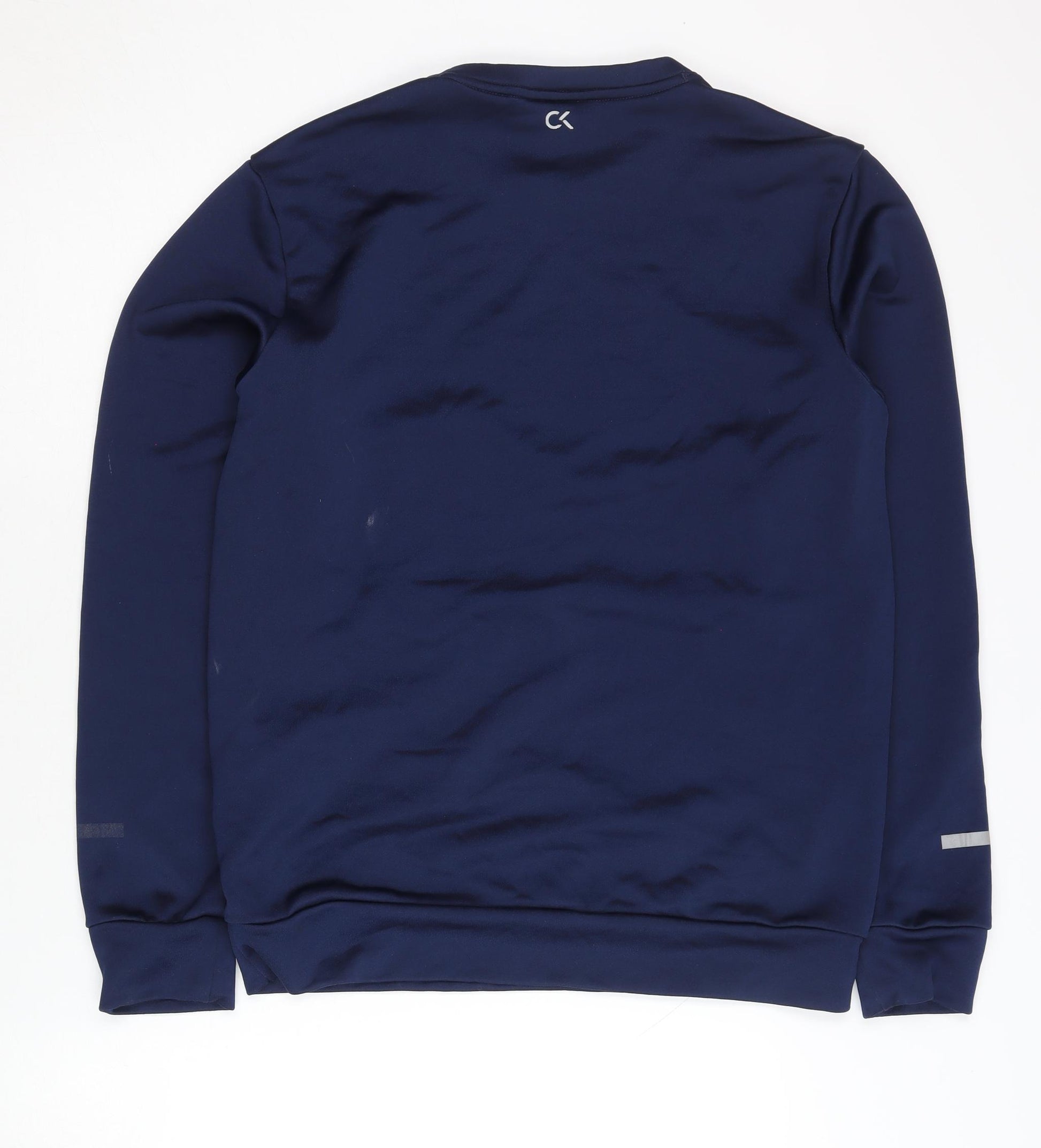 Introducing the Calvin Klein Men's Sweatshirt, a perfect blend of comfort and style. In a striking blue color, this pullover sweatshirt is designed for the modern man. Crafted from soft jersey fabric with 100% polyester, this sweatshirt ensures both durability and a comfortable fit. Ideal for the Autumn and Winter seasons, this versatile piece features long sleeves and a classic crew neckline. The standout logo accent adds a touch of sophistication, making it a stylish choice for any casual outing. Despite minor stains on the sleeve, its overall condition is rated 'Very Good'. Machine washable for easy care, this sweatshirt is both practical and stylish. Elevate your wardrobe with this premium piece from Calvin Klein.