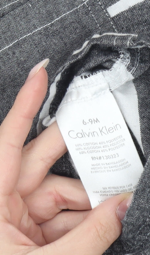 This adorable Calvin Klein unisex baby dungaree is a stylish and practical choice for little ones aged 6-9 months. Crafted from a durable and breathable cotton and polyester blend, this one-piece outfit offers the perfect balance of comfort and resilience, making it ideal for everyday wear. The material has a soft woven finish that feels gentle against delicate skin while remaining durable enough to handle active movement.Featuring a classic grey and white striped pattern, the dungaree is timeless and versatile, suitable for both boys and girls. Functional button fastenings on the straps and sides add ease of dressing, while secure snaps along the bottom ensure hassle-free nappy changes. The design includes a chest pocket and side pockets, adding both style and practicality.Perfect for casual outings, playdates, and everyday comfort, this dungaree transitions well through multiple seasons. It can be layered with a t-shirt or long sleeve top during cooler spring and autumn days or worn on its own as a comfortable summer outfit. With its sleeveless square neckline design, it provides freedom of movement while maintaining a cute, fashionable look.The garment is machine washable, making it easy to care for busy parents, and retains its shape and striped design wash after wash. While this piece does not have original sales tags, it remains in excellent condition with no visible defects, ensuring plenty of wear left for your little one.A must-have in any baby’s wardrobe, this Calvin Klein striped dungaree is not only practical but also stylish, offering designer quality at an affordable price. Whether as a thoughtful gift or a staple addition to your child’s everyday wear, it’s a piece that combines comfort, functionality, and timeless fashion appeal.