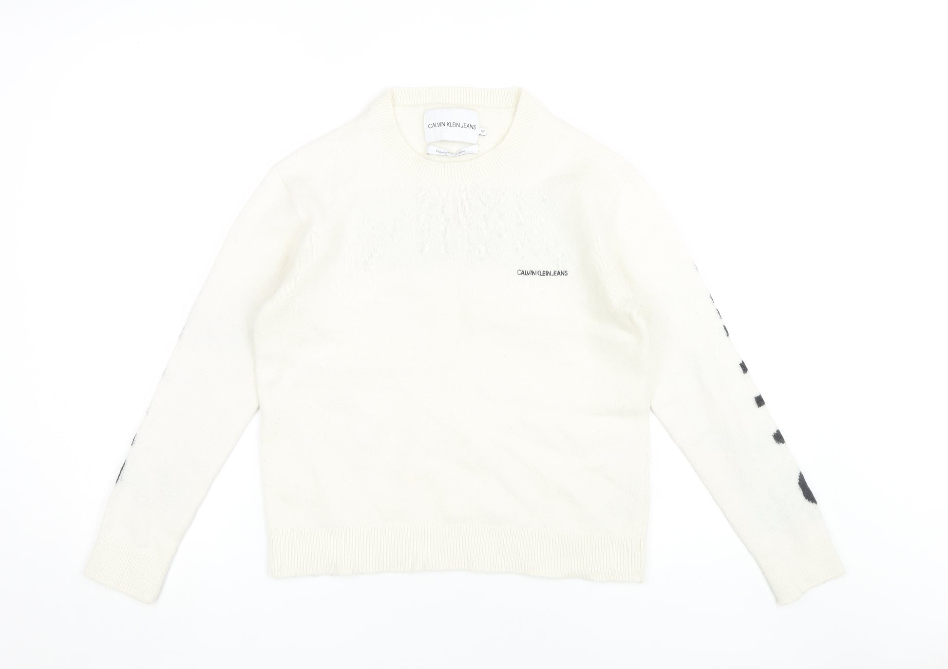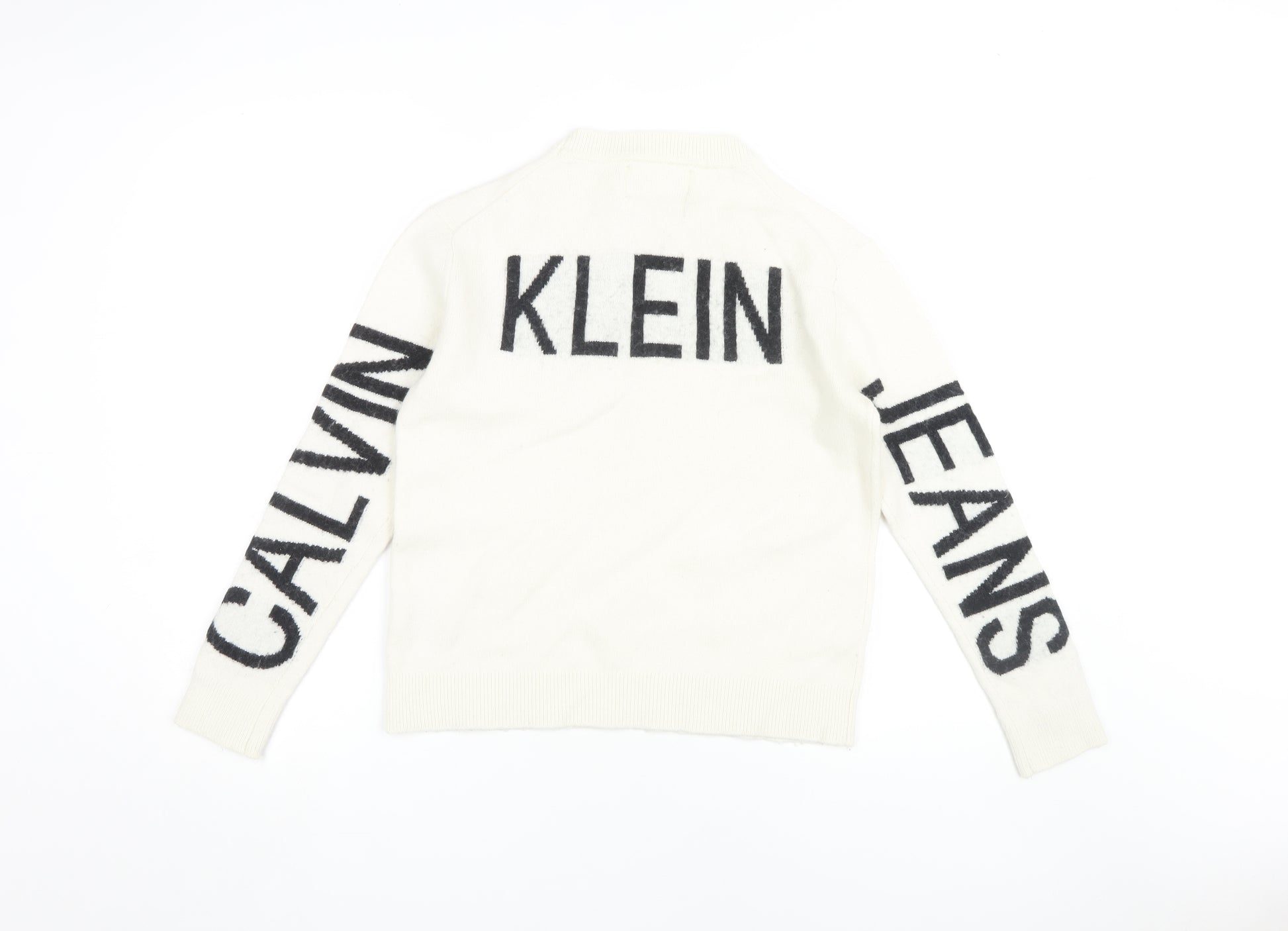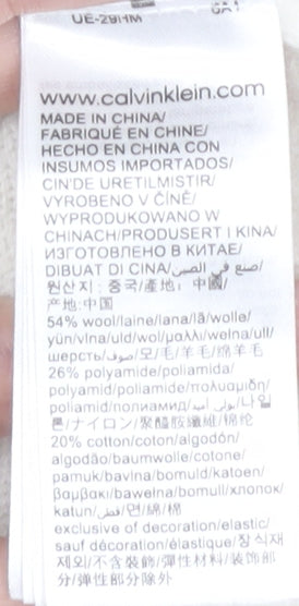 Embrace a blend of style and comfort with this Calvin Klein Women's Ivory Pullover Jumper, designed with a classic crew neck to add a touch of sophistication to your wardrobe. Crafted from a premium wool blend featuring polyamide, cotton, and elastane, this jumper provides both warmth and breathability, making it an ideal choice for the autumn and winter seasons. The regular fit ensures a flattering silhouette, while the raglan sleeve design adds a subtle detail to elevate your casual attire. Sporting Calvin Klein's signature logo accent, it brings a modern edge to a timeless piece. Perfect for casual occasions, this jumper pairs effortlessly with jeans or skirts, creating endless styling possibilities. Whether you're stepping out for a relaxed brunch or cozying up at home, this versatile piece promises to be a staple in your wardrobe, whispering elegance and understated glamour. With no visible defects, it reassures excellent condition, ensuring you wear it with confidence. Opt for this Calvin Klein jumper, where luxury meets everyday functionality.