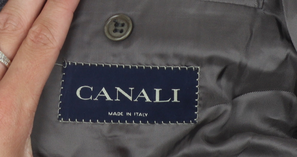 Elevate your formal wardrobe with this classic Canali men's suit jacket in a refined grey hue, crafted from luxurious wool that ensures both comfort and sophistication. This jacket, made in Italy, carries the hallmark of quality Canali is renowned for. Designed for the discerning gentleman, it features a timeless three-button front, complemented by the elegance of four-button sleeve detailing, adding a distinct touch to your ensemble. The jacket is styled for versatility, making it ideal for various occasions, whether business meetings or formal events. The Cupro lining provides a smooth fit, enhancing the overall wearing experience. Despite showing some minor wear, this jacket maintains its sophisticated allure, ensuring you present yourself in style. Perfect for those who appreciate refined tailoring and premium materials, this jacket is a valuable addition to any wardrobe. Embrace the heritage of Italian craftsmanship with this distinguished Canali suit jacket.
