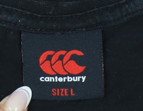 This Canterbury men's T-shirt is a perfect addition to any wardrobe, blending comfort and style effortlessly. Crafted from 100% breathable cotton, this black crew neck T-shirt offers a classic regular fit, ideal for sports enthusiasts and casual everyday wear alike. Embellished with a striking logo, it embodies an understated yet fashionable look. Its short sleeves and solid pattern make it versatile for any season. Easy to care for, this machine washable jersey fabric top is great for those on the go. Despite some slight wear, this T-shirt remains in excellent condition and is perfect for a sporty, laid-back outfit. Add this durable and comfortable Canterbury T-shirt to your collection today.