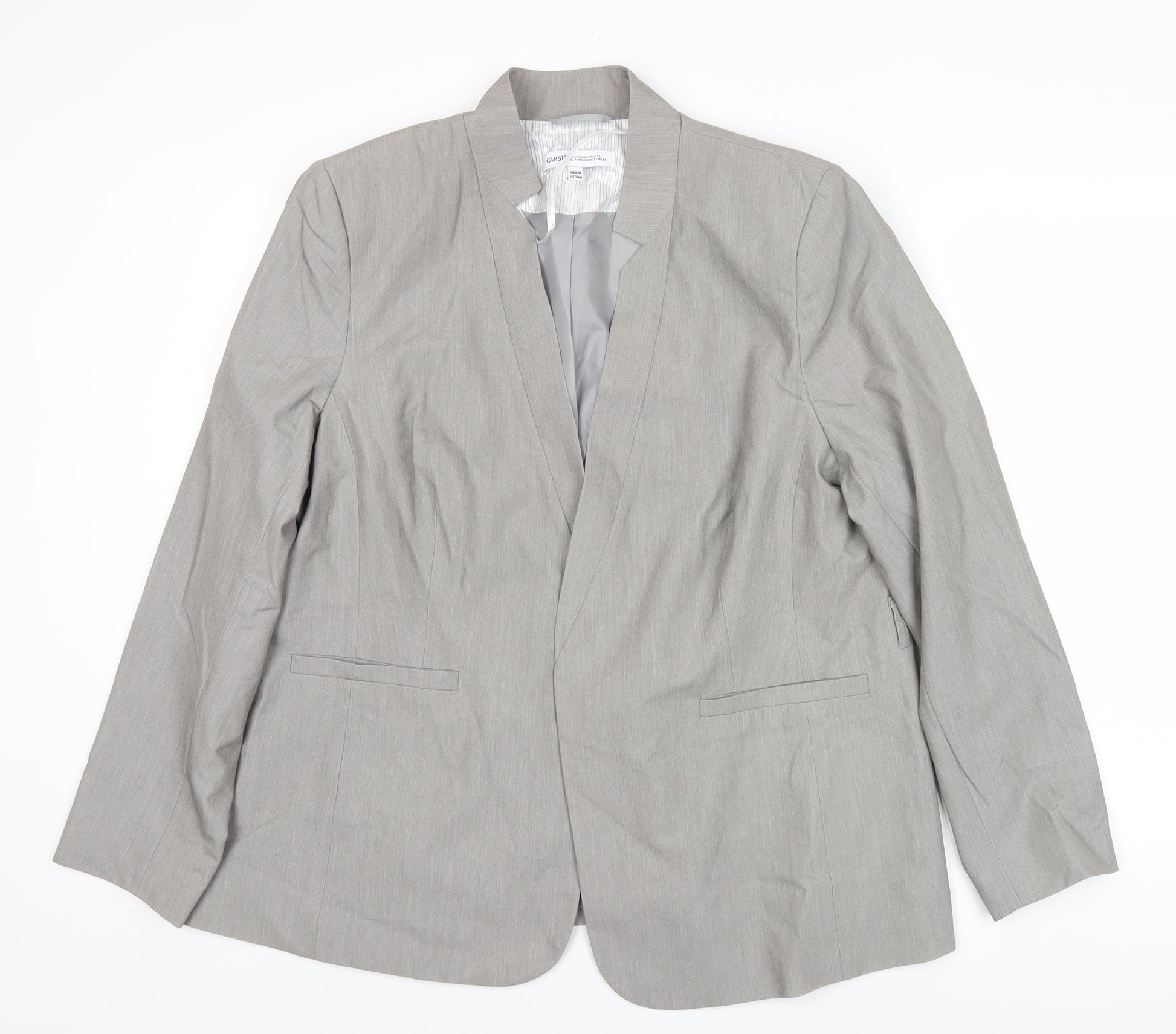 This stylish women's grey blazer by Capsule is a versatile addition to any wardrobe, perfect for business, formal, and workwear occasions. Designed in a classic silhouette, this single-breasted jacket in a regular fit delivers sophistication without sacrificing comfort. The understated grey tone makes it easy to pair with a wide range of wardrobe staples, ensuring it is a timeless piece that can transition seamlessly between professional and social settings. Crafted from a quality woven fabric, the main body consists of 74% polyester, 18% viscose, and 8% elastane, creating a soft yet structured finish with a touch of stretch for ease of movement. The blazer is fully lined in 100% polyester, enhancing durability and comfort. The jacket features a tailored design with slim welt front pockets and a notch lapel style, offering a clean, modern appearance. The long sleeves and mid-weight material make it suitable for year-round use, especially ideal for autumn, winter, and spring wear. Its machine-washable material ensures effortless care, adding practicality to its sophisticated styling. This particular blazer is in very good pre-owned condition, with only a light mark visible on the back panel, but overall retains its structure and smart appearance. With no front closure buttons, it maintains a sleek, open-front look that flatters the figure and balances both formal and relaxed ensembles. Pair it with tailored trousers, a pencil skirt, or even smart jeans for multiple outfit options. Perfect for the modern professional looking for a combination of elegance, comfort, and wearability, this grey Capsule blazer is a wardrobe essential at a very reasonable price. Invest in this versatile piece to instantly elevate your work and occasionwear collection.