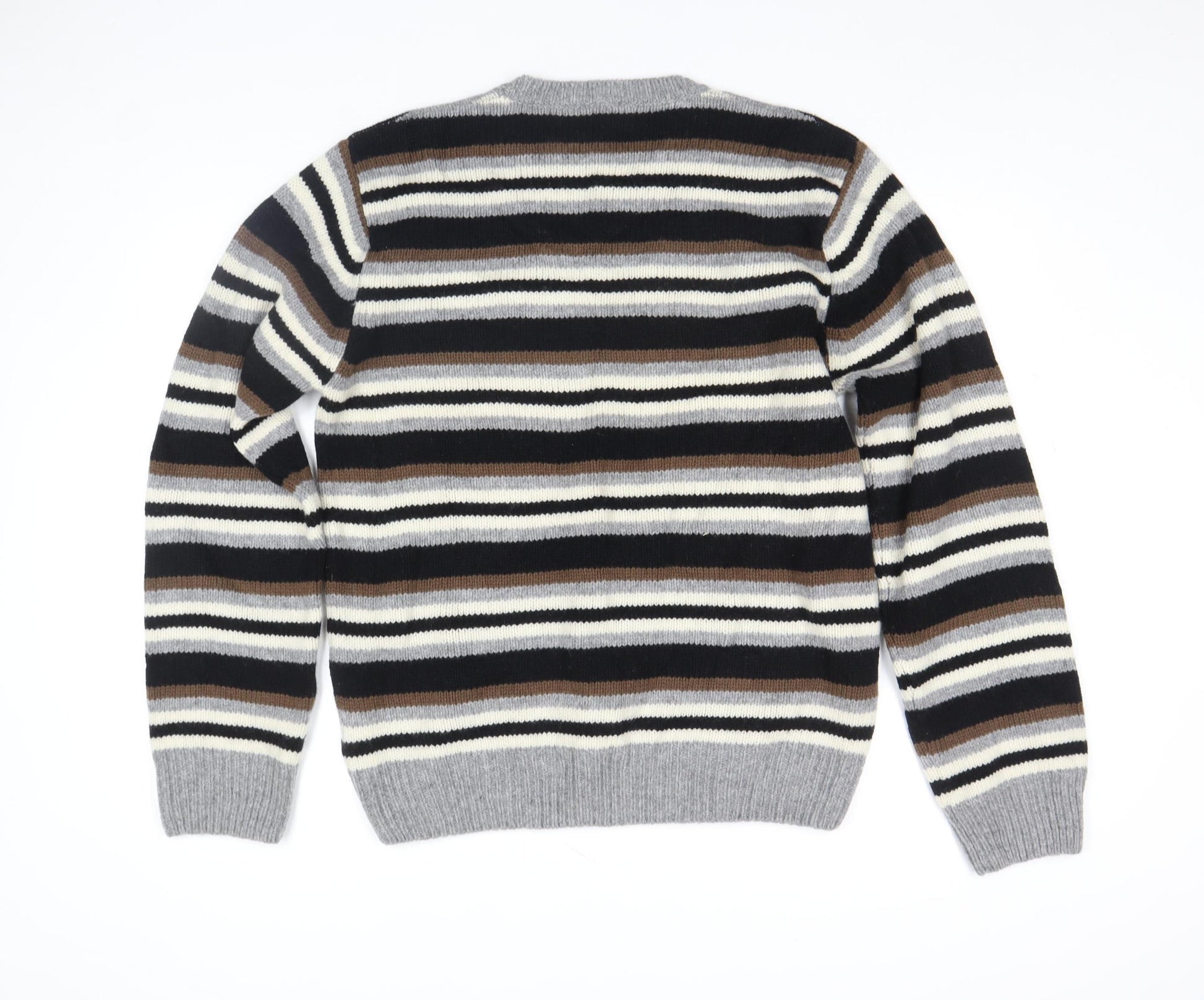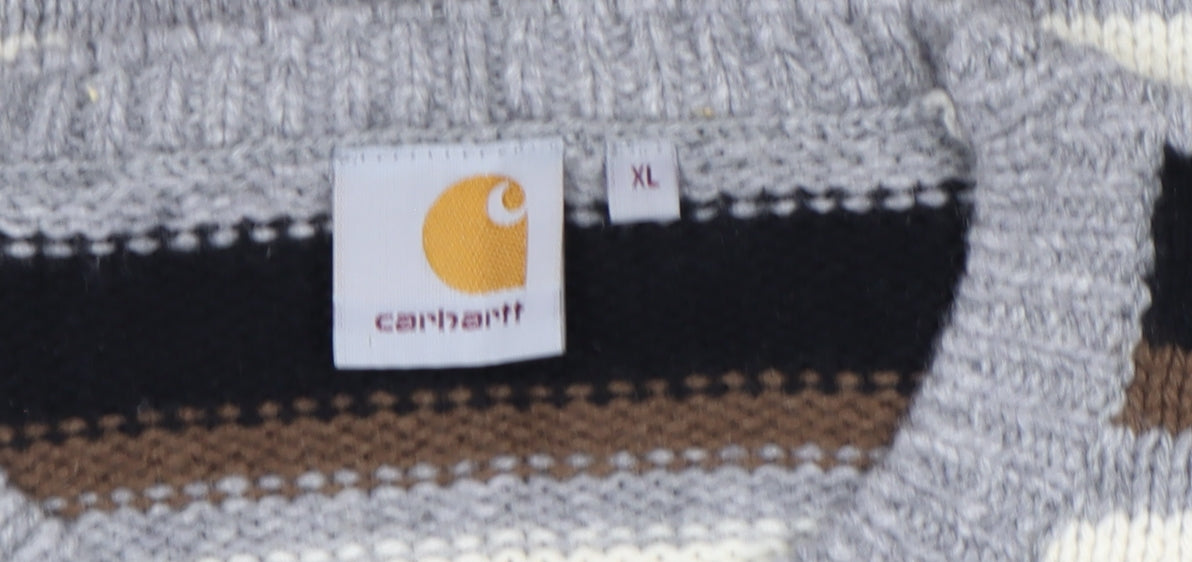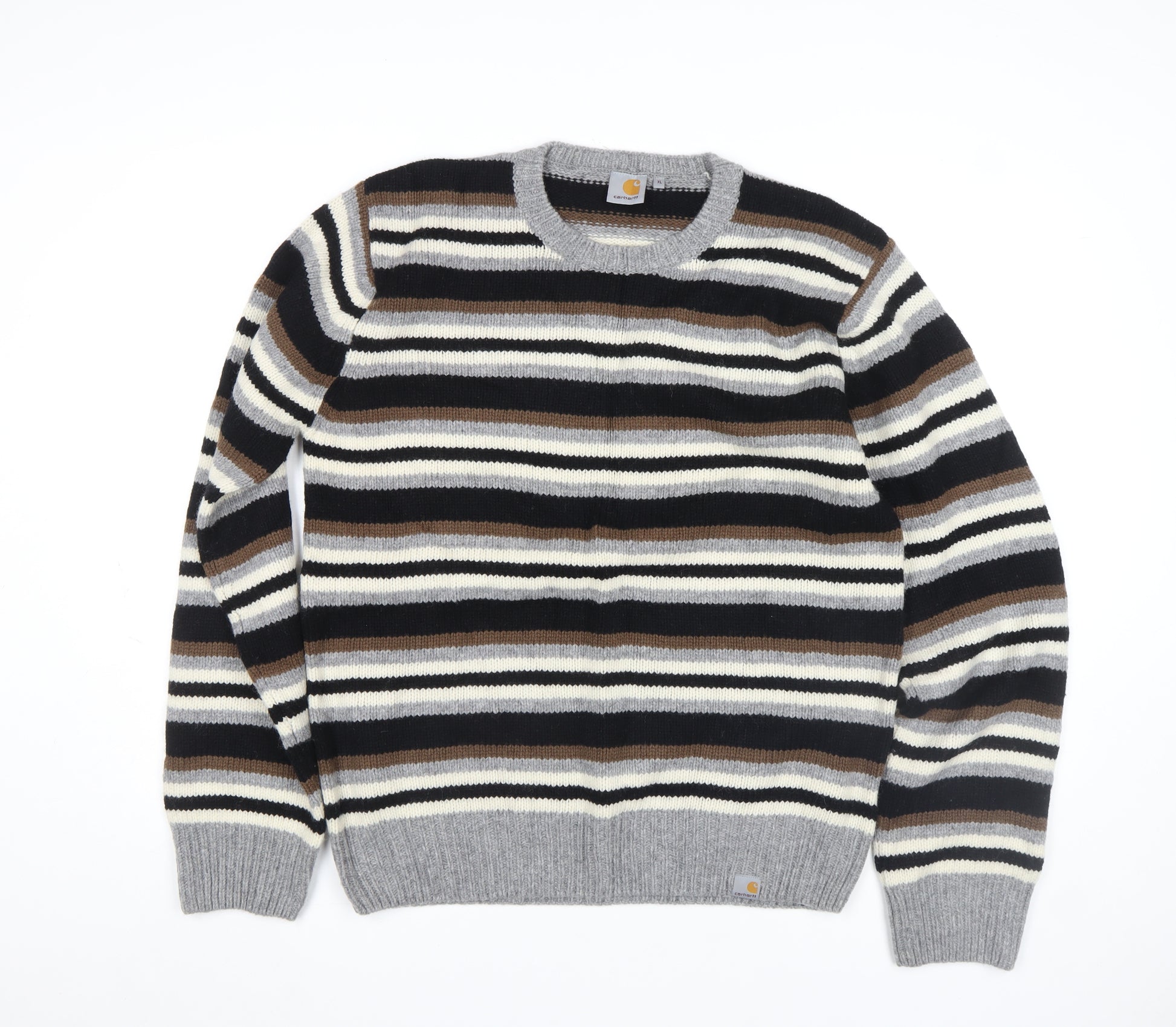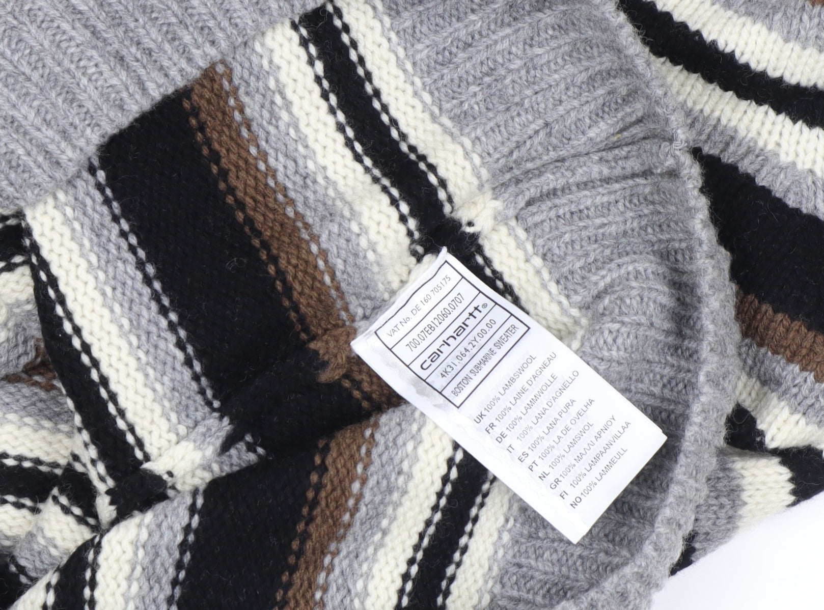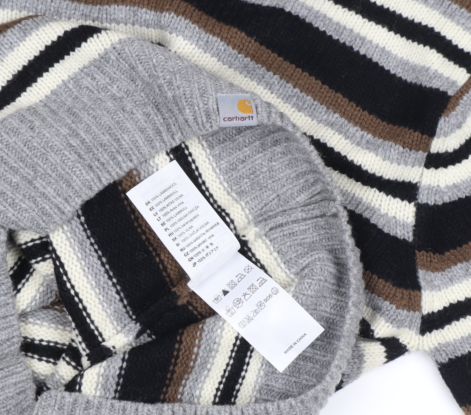 Upgrade your knitwear collection with this Carhartt men's striped jumper in size XL, crafted from 100% pure lambswool. Renowned for its warmth, breathability, and natural softness, the wool fabric delivers lasting comfort and superior insulation during the colder months. The chunky-knit texture and classic crew-neck design add timeless appeal, making this pullover a versatile choice for both casual and layered outfits. Presented in a stylish striped pattern with shades of black, grey, brown, and cream, it brings a bold yet understated look to your winter wardrobe.Designed for regular fit and featuring long sleeves and ribbed cuffs, it provides a cosy and comfortable feel while maintaining a smart silhouette. The quality and craftsmanship expected of Carhartt shine through in the durable construction, offering long-lasting wear that resists pilling and retains its shape. Whether paired with jeans for a relaxed weekend look or layered over a shirt for a more polished style, this piece effortlessly balances practicality and streetwear cool.Perfect for autumn and winter wear, this jumper embodies Carhartt’s dedication to combining style, comfort, and durability. The breathable knit ensures all-season versatility, while the natural fibres make it ideal for those seeking a reliable, well-made wardrobe staple. In excellent used condition with minimal signs of wear and no visible flaws, this garment is ready to deliver lasting warmth and timeless appeal. Ideal for casual outings, laid-back days, or simply staying stylish in comfort, this Carhartt lambswool jumper is a must-have for any modern man seeking quality knitwear that will stand the test of time.