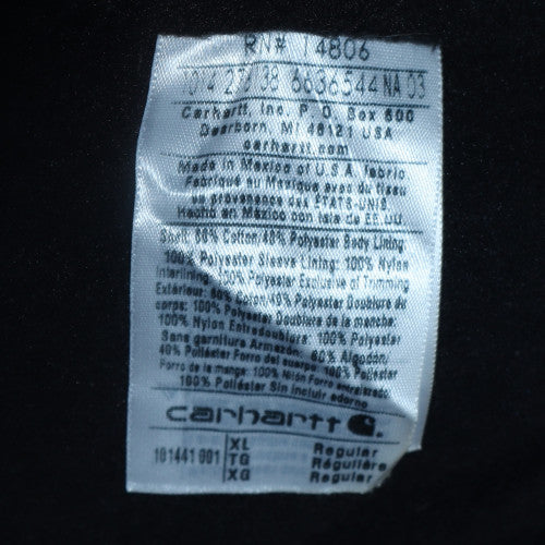 Stay warm and comfortable in this rugged Carhartt men's black canvas workwear jacket. Designed with the brand’s signature durability, this mid-length jacket features a tough outer shell made from a cotton-nylon blend, providing resilience against everyday wear while maintaining comfort and breathability. The interior is lined with smooth polyester for warmth, making it an ideal choice for colder autumn and winter days. This men’s XL regular-fit jacket is both functional and practical, with a full front zip closure, multiple pockets for convenience, and the iconic Carhartt logo accents on the chest. Its collared design and structured silhouette give it a classic, masculine look suitable for work, outdoor activities, or casual wear.Built for utility and everyday toughness, this jacket has a simple yet robust design — perfect for layering over shirts or sweatshirts. The lining helps retain warmth without bulk, making it comfortable for a long day's work or a weekend outing. Its minimalist black finish gives it versatile styling potential, pairing easily with jeans or work trousers. Visible stitching and durable zip hardware reinforce its premium craftsmanship.In very good pre-owned condition, this piece shows only light signs of wear with faint marks consistent with gentle use but retains excellent structural quality. It’s a great value for anyone who appreciates hardwearing and dependable clothing. A staple outerwear piece for practical men who value quality, reliability, and comfort, this Carhartt jacket is a true wardrobe essential for cold-weather workdays or outdoor adventures alike.