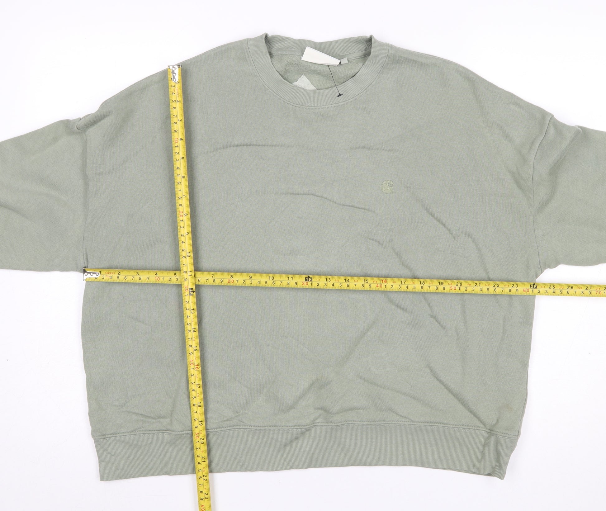 Discover laid-back contemporary style with this Carhartt WIP Women’s Chester Sweatshirt in a soft sage green tone. Crafted from 100% cotton, this sweatshirt combines comfort and durability in a relaxed silhouette that works effortlessly for everyday wear. The ribbed cuffs and waistband ensure a comfortable fit, while the crew neckline adds a timeless touch. The subtle embroidered Carhartt logo on the chest showcases understated branding synonymous with quality craftsmanship. Perfect for layering across all seasons, this piece offers breathable, easy-care wear with a soft brushed inner texture for added warmth and comfort. Whether paired with jeans for casual days or leggings for a sporty look, the Chester Sweatshirt brings versatility and relaxed sophistication to your wardrobe. Designed for women who value both function and effortless fashion, it’s ideal for transitional styling and weekend wear. This pre-owned sweatshirt remains in excellent condition, showing light general wear with no visible stains or damage, ensuring plenty of life left. Combine this piece with neutral tones or denim for a laid-back urban aesthetic, or layer it over a cotton shirt for a more refined casual look. Suited for casual, everyday, and travel occasions, this comfortable classic from Carhartt WIP is a must-have for any modern wardrobe, offering reliable quality and timeless appeal in one effortlessly stylish garment.