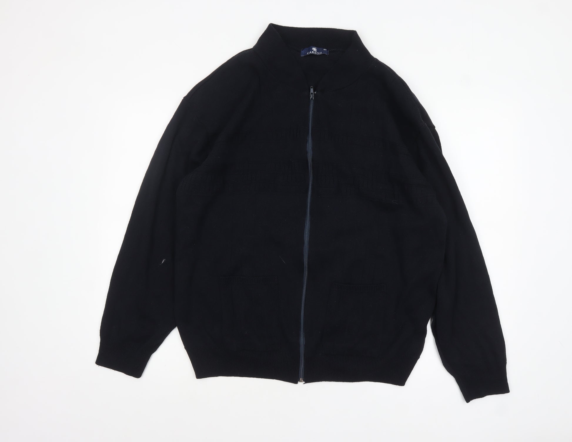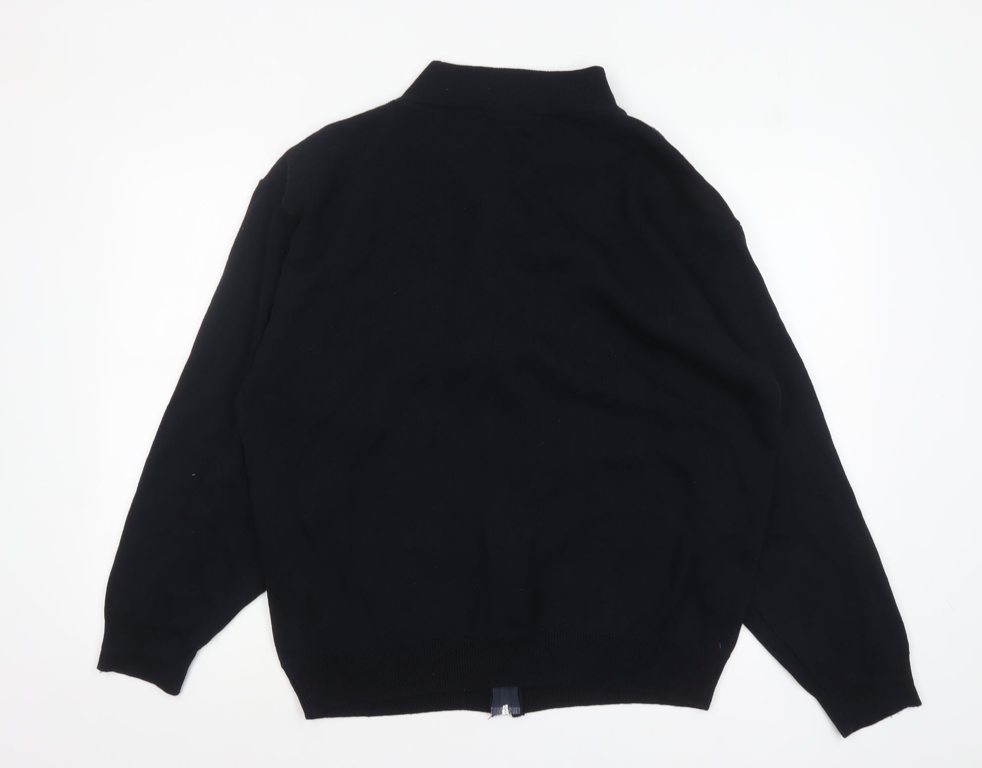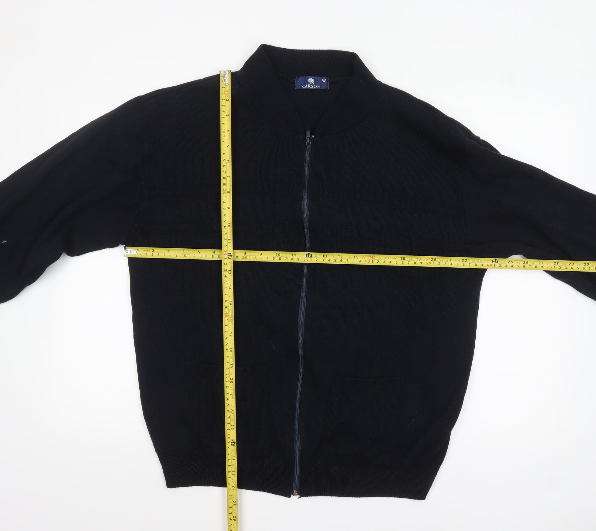 This Carson men’s black full zip jumper combines classic comfort with timeless practicality, making it an ideal choice for relaxed casual wear throughout the cooler months. Crafted from a soft blend of 50% cotton and 50% acrylic, the fabric provides the perfect balance of warmth, breathability, and durability, ensuring a comfortable wear that maintains its shape and finish. The high neck and full front zip closure add a touch of sophistication while offering easy layering options with shirts or t‑shirts underneath. Featuring a tight-knit design that brings structure and a refined texture, this jumper has a smooth appearance that pairs well with both jeans and chinos for any smart-casual occasion. The integrated front pockets enhance the practicality of the garment, ideal for keeping hands warm or carrying small essentials. Its regular fit allows unrestricted movement while maintaining a flattering silhouette suitable for everyday wear. The deep black colour gives it a versatile and stylish edge, making it effortless to coordinate with other wardrobe staples. Suitable for autumn, winter, and spring seasons, it is fully machine washable for easy care and long‑lasting wear. The overall condition is very good, showing only minor fabric pulling on the sleeve, with no stains, holes or significant wear. Whether heading to a casual meeting, enjoying a weekend outing, or simply adding an extra layer of comfort on a cold day, this Carson cotton blend jumper offers a smart, reliable and long‑wearing addition to any man’s wardrobe. An excellent choice for someone seeking both comfort and understated style in a quality knitwear piece.