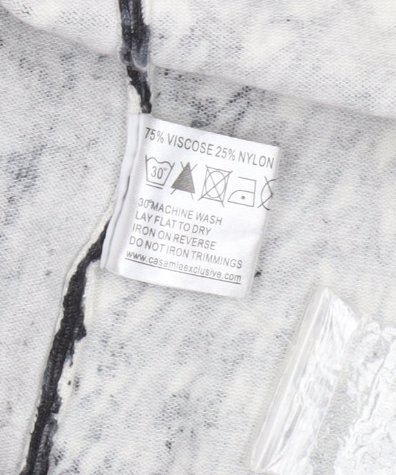 Add a bold and contemporary edge to your wardrobe with this striking Casamia Exclusive women’s cardigan. Designed in a mesmerising monochrome animal print pattern, this piece offers a perfect balance of sophistication and modern style. Made from a soft blend of 75% viscose and 25% nylon, it provides a lightweight yet comfortable feel, ideal for layering during the autumn and winter seasons. The open front style enhances its relaxed silhouette, making it easy to pair with casual or smart-casual outfits. This cardigan features a flattering V-neck and long sleeves, offering both comfort and coverage. The smooth knit texture ensures durability and drape, maintaining its shape wear after wear. Perfect for both casual outings and cosy evenings, it adds texture and personality to any look. The regular fit ensures ease of movement while accentuating your natural shape without clinging. The elegant black and white pattern effortlessly complements neutral and bold tones alike, allowing versatility in styling. Pair this piece with tailored trousers, jeans, or a fitted skirt for a refined finish. Machine washable for easy care, it’s a practical addition to your seasonal collection. Even with its distinctive design, this Casamia Exclusive cardigan remains timeless, exuding understated luxury through its quality construction. Whether layered over a plain tee for effortless chic or styled over a blouse for added polish, this cardigan promises to elevate any outfit. Enjoy the blend of comfort, convenience, and fashion with this beautifully patterned essential. An expressive layering option for the stylish modern woman who values both elegance and individuality.