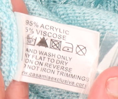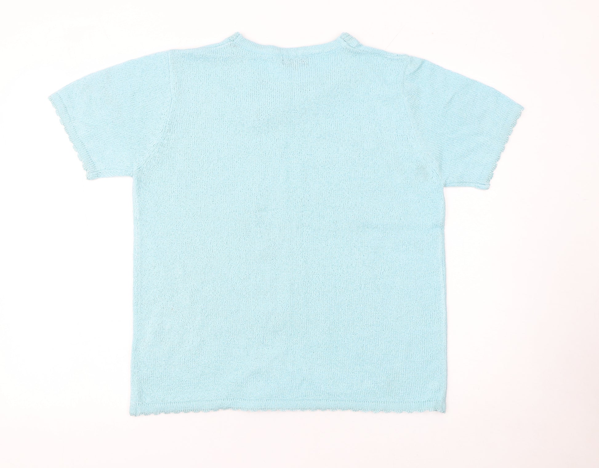 Add a charming touch to your wardrobe with this lovely women’s jumper by Casamia. In a soft pastel blue tone, this knitted pullover is designed in a lightweight composition, making it ideal for milder weather and layering during spring and summer. The jumper is crafted from a blend of acrylic and viscose, giving it a comfortable soft hand feel while keeping it easy to care for. Featuring a round crew neckline with a single button accent for added style, the short sleeves make it perfect for casual daytime wear. Subtle floral embroidery and delicate cable-knit details on the front enhance its feminine and elegant appeal without being overly ornate. The regular fit makes it comfortable for everyday use, suitable for pairing with jeans, skirts or smart trousers depending on your outfit needs. Overall, this top captures a versatile balance of comfort, quality and understated style, making it a great choice for casual wear, light office days, or leisurely afternoons. Hand wash only to keep the material and embroidery looking their best. The jumper is in excellent pre-owned condition with minimal signs of previous use and no noticeable marks or damage. Whether you’re refreshing your everyday wardrobe or looking for a charming knit with unique detailing, this Casamia embroidered short sleeve jumper offers a lovely mix of practical comfort and classic design at an affordable price. Ideal for those who enjoy light, textured knits with delicate detailing that can be worn season after season.