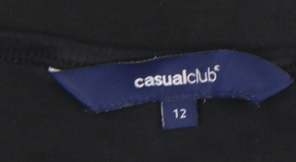 Step out in effortless everyday style with this charming black short sleeve T-shirt by Casual Club. Designed for women who appreciate a combination of comfort and understated detail, this top features a sparkling rhinestone cat motif at the chest, adding just the right touch of playful personality to a classic silhouette. Crafted from a soft jersey fabric blend of 95% cotton and 5% elastane, it offers breathability and gentle stretch for a comfortable, flattering fit that moves with you. The fabric’s natural softness and lightweight texture make it perfect for layering or wearing alone through spring, summer, and early autumn. The crew neckline and classic fitted short sleeves enhance the simple, modern shape, making this an easy wardrobe essential. With its solid black colour, it pairs beautifully with everything from denim jeans to printed skirts or tailored trousers. Whether you’re dressing casually for the weekend, out for a relaxed lunch, or running errands, this top ensures you stay stylish and comfortable. Its versatile design and durable cotton composition provide lasting wear, while the subtle rhinestone accent gives it a unique twist that sets it apart from an ordinary tee. Machine washable and low maintenance, it fits seamlessly into your busy lifestyle. In excellent pre-owned condition with no visible flaws, this Casual Club T-shirt is ready to become a firm favourite in your collection. Ideal for casual and everyday wear, it’s a simple yet standout piece that adds a touch of sparkle to your day. Pick yours up now and enjoy timeless comfort and style at an affordable price.