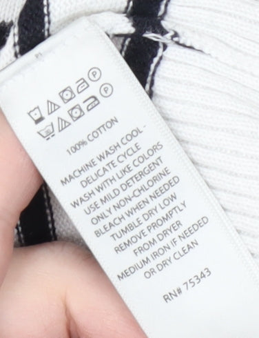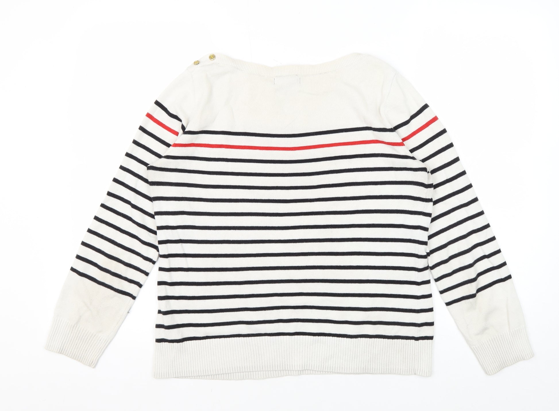 Elevate your casual wardrobe with this stylish Catherine Malandrino pullover jumper. Crafted for women, this jumper features a boat neck and long sleeves, providing a chic and comfortable fit perfect for all seasons. Emphasizing a trendy striped pattern, it combines a classic colour palette of multicoloured stripes to pair effortlessly with any outfit. Made of 100% cotton, this jumper offers warmth and comfort, making it an ideal choice for both autumn and spring. Accented with buttons for an added touch of elegance, this regular fit jumper is machine washable for easy maintenance. Its excellent condition indicates it's been lightly worn, offering great value at an accessible price. Perfect for casual outings, this jumper is a versatile addition to your collection. Pair it with jeans for a laid-back look or dress it up with a skirt for an evening out. Perfect for those seeking both style and comfort in their everyday attire.