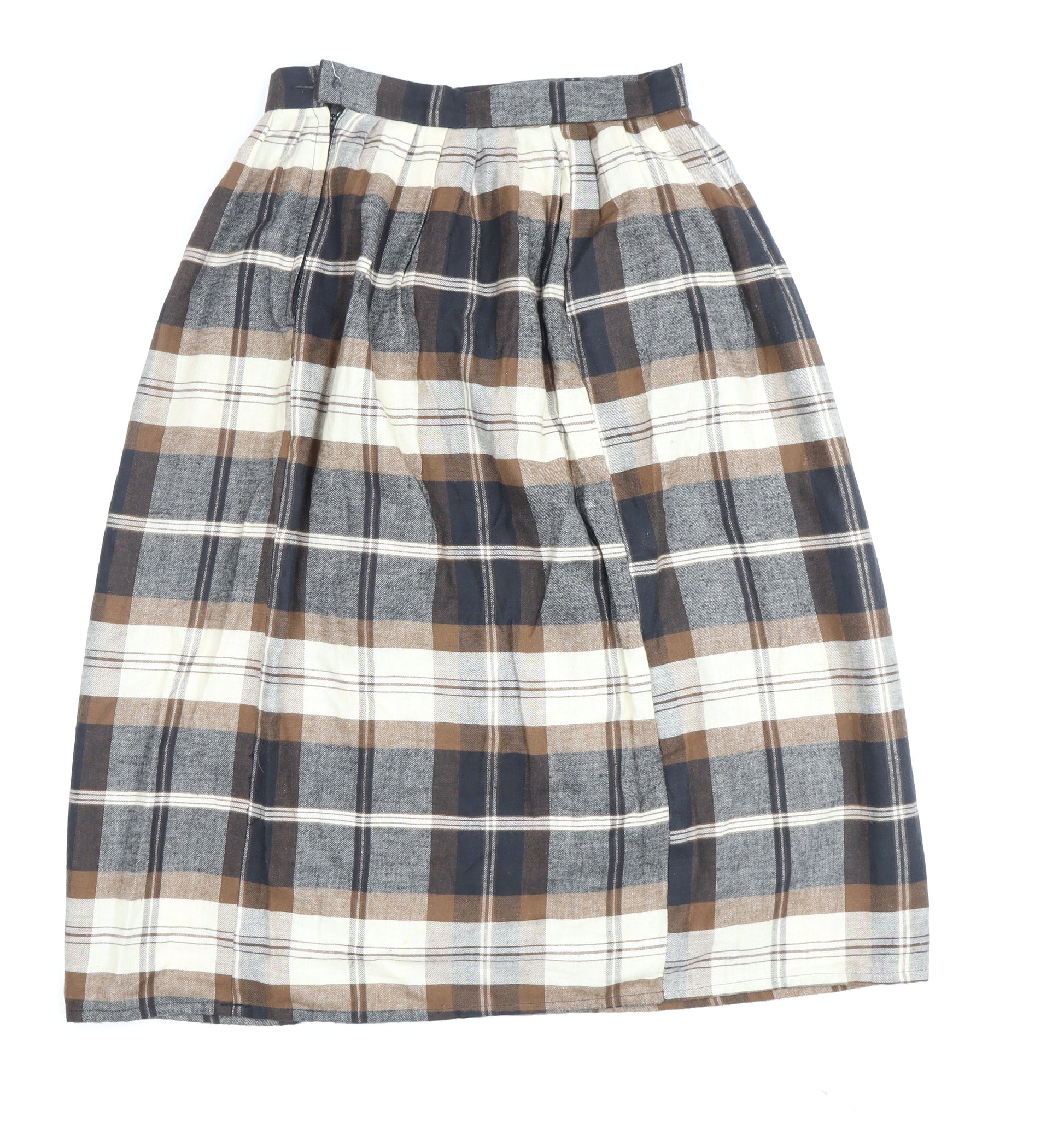 Introducing a classic piece, the Cavalier Women's Plaid Midi Skirt in an appealing multicoloured palette featuring earthy brown tones. Perfectly tailored for the fashion-forward individual, this skirt combines comfort with style, offering a flattering pleated silhouette that gently sways with each step. Its mid-rise fit offers effortless elegance and flexibility, ensuring it's ideal for both casual outings and semi-formal gatherings. Crafted from 100% cotton, it provides a soft and breathable experience, ensuring comfort throughout the cooler seasons. Whether paired with a cosy jumper for a relaxed day out or elevated with a fitted blouse for a chic evening look, this versatile skirt is set to become a staple in your wardrobe. Embrace its vintage charm and let its plaid pattern add a touch of nostalgic flair to your ensemble. Already in excellent condition, this item promises style longevity, fit for all-year luxury.