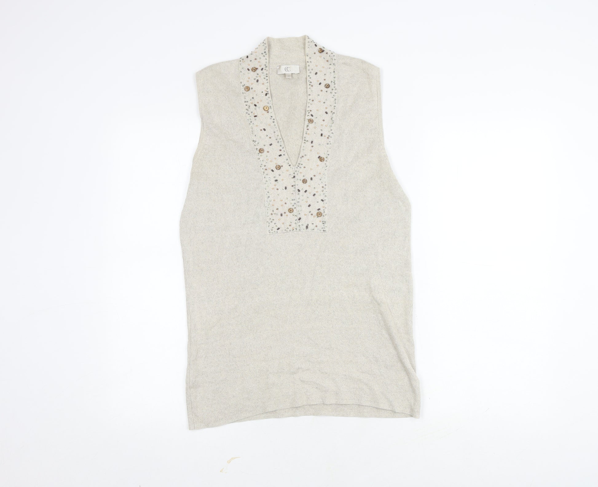 This stylish beige blouse from CC is perfect for casual summer outings. Made for the fashion-conscious woman, it flaunts a comfortable regular fit. The sleeveless design with a sophisticated V-neckline adds a touch of elegance to your look. Crafted from a soft cotton blend, this knit fabric blouse is lightweight and ideal for warm weather days.