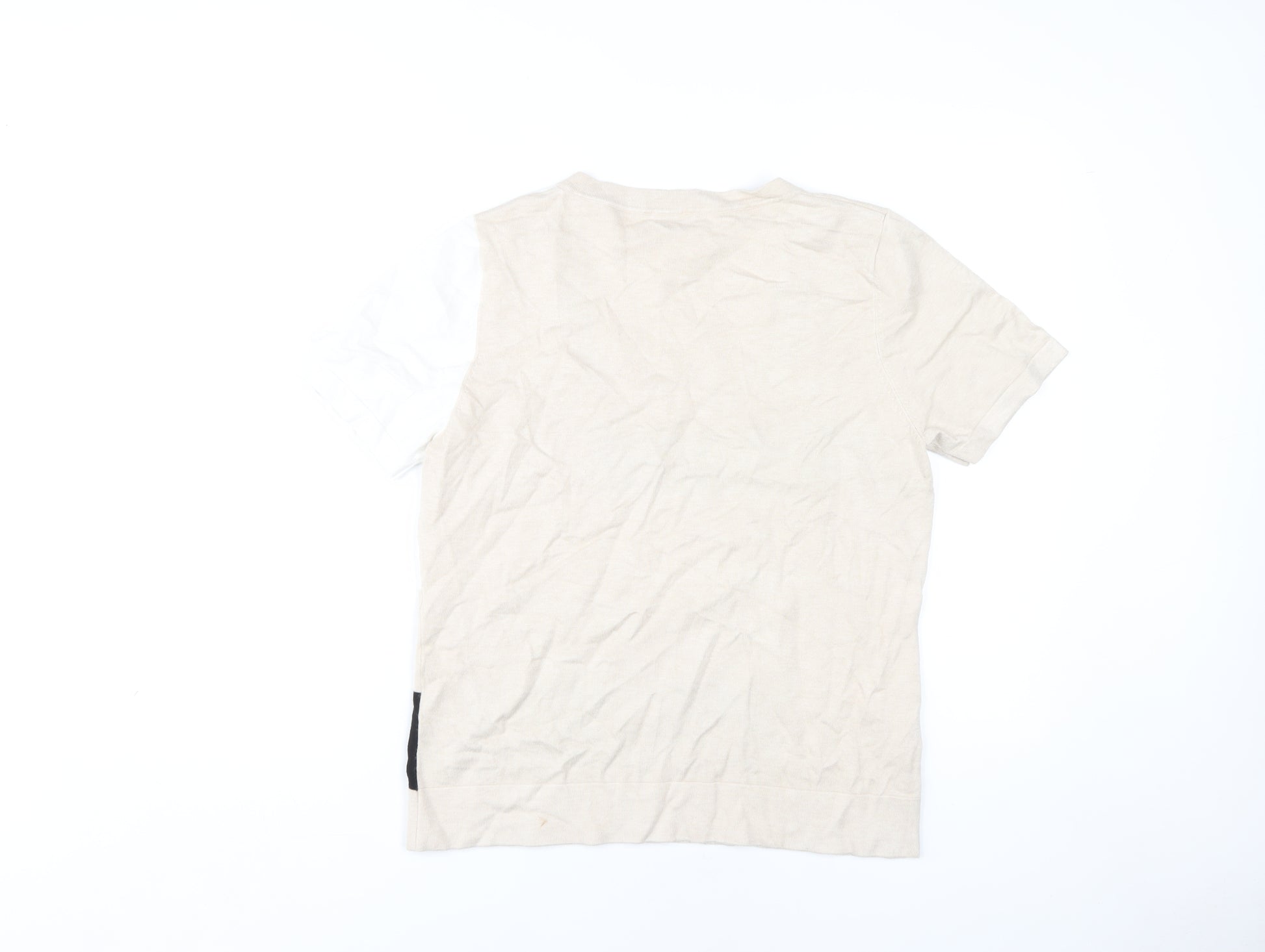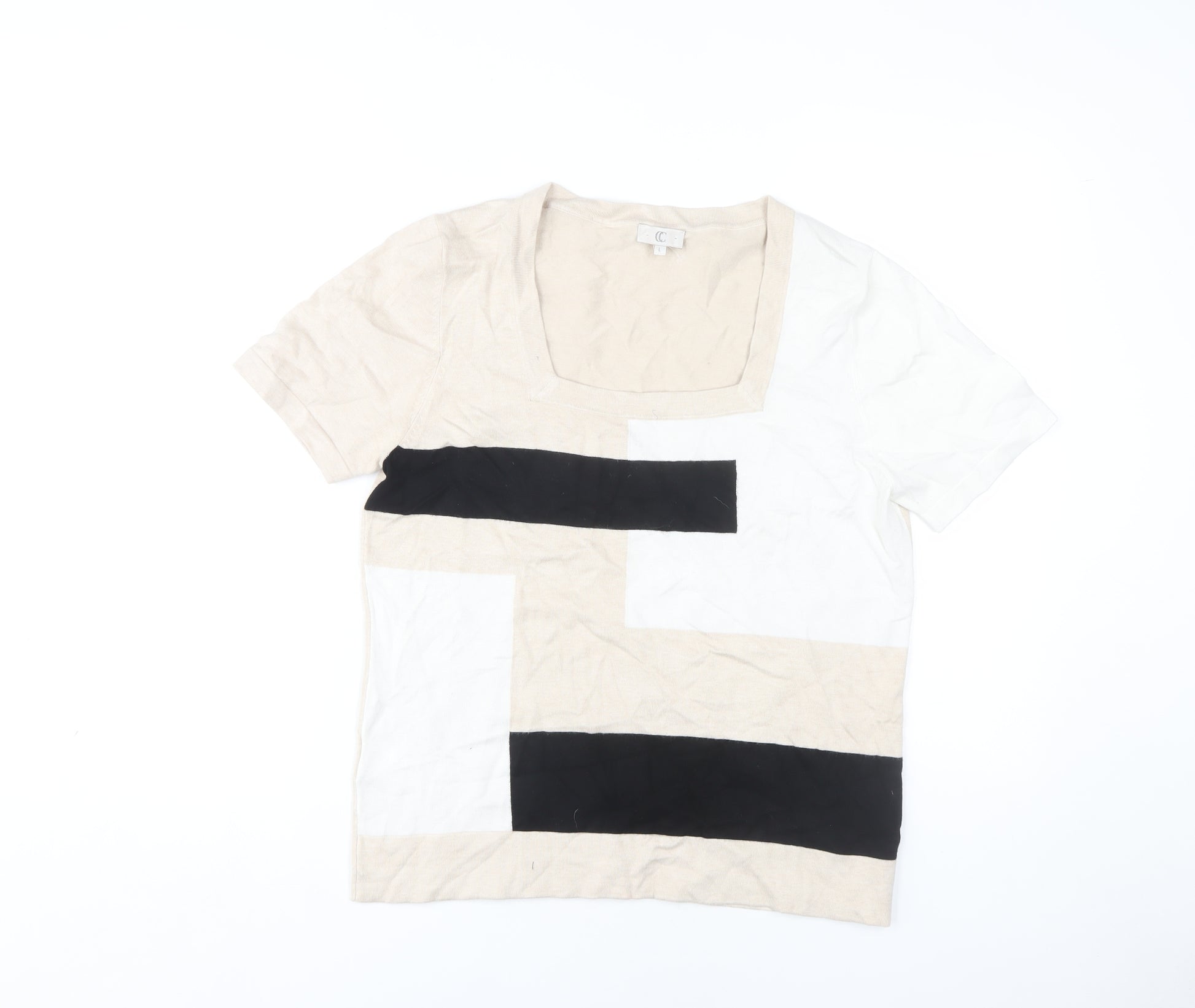 Elevate your wardrobe with this CC Women's Beige Geometric Knit Jumper in size Large. Crafted from a soft blend of viscose and nylon, this stylish piece offers comfort and durability. Featuring a chic square neckline and vibrant colour block patterns in beige, black, and white, this jumper is perfect for making a fashion statement. Ideal for casual outings or adding a pop of colour to your workwear, this versatile piece is a must-have. The short sleeves and breathable knit fabric ensure you'll stay comfortable and stylish all day long. Minimal signs of wear suggest this item is in excellent condition, ready to offer a trendy touch to your ensemble. Don't miss out on the opportunity to own this eye-catching jumper—grab it today for an incredible price!