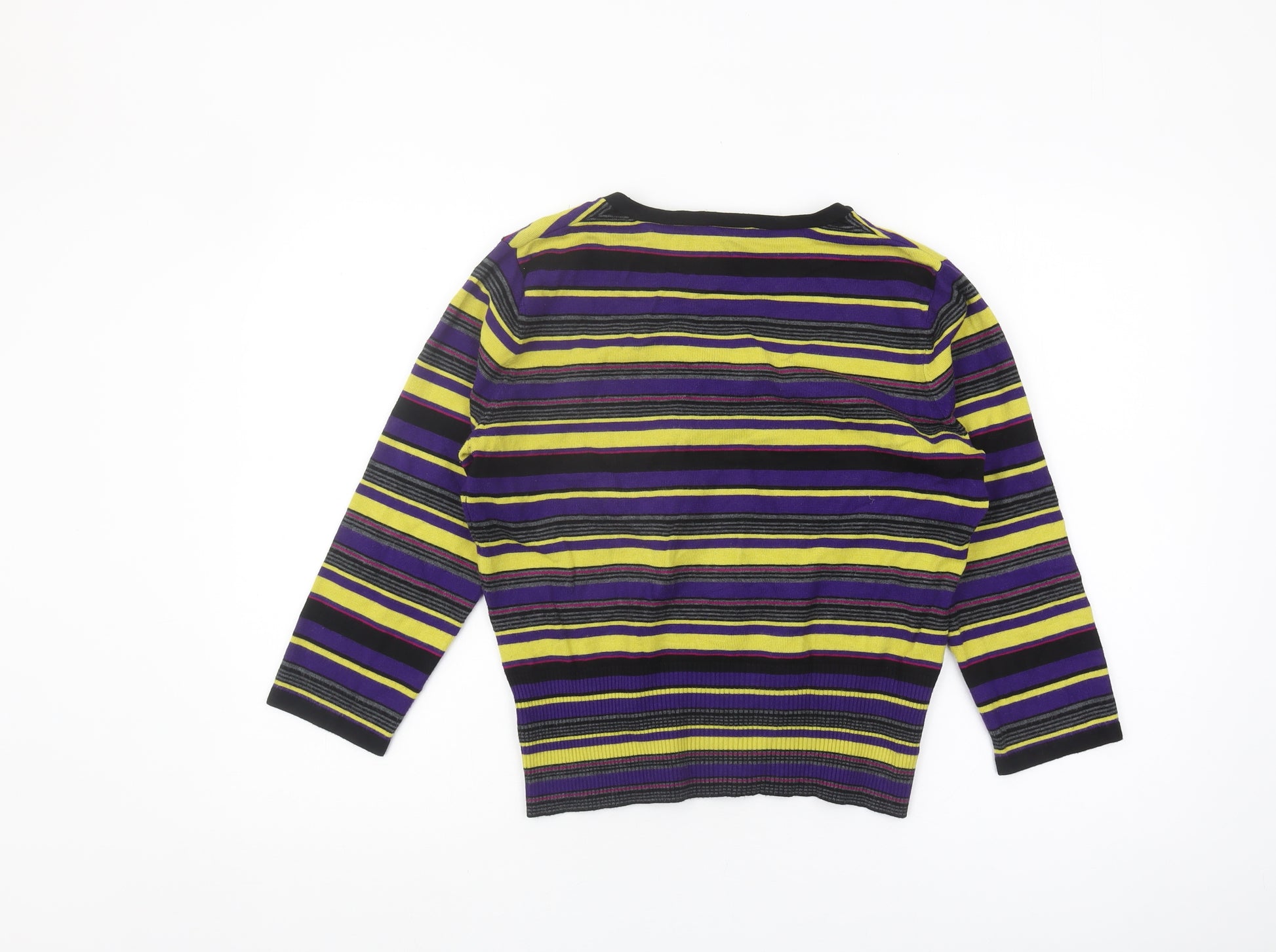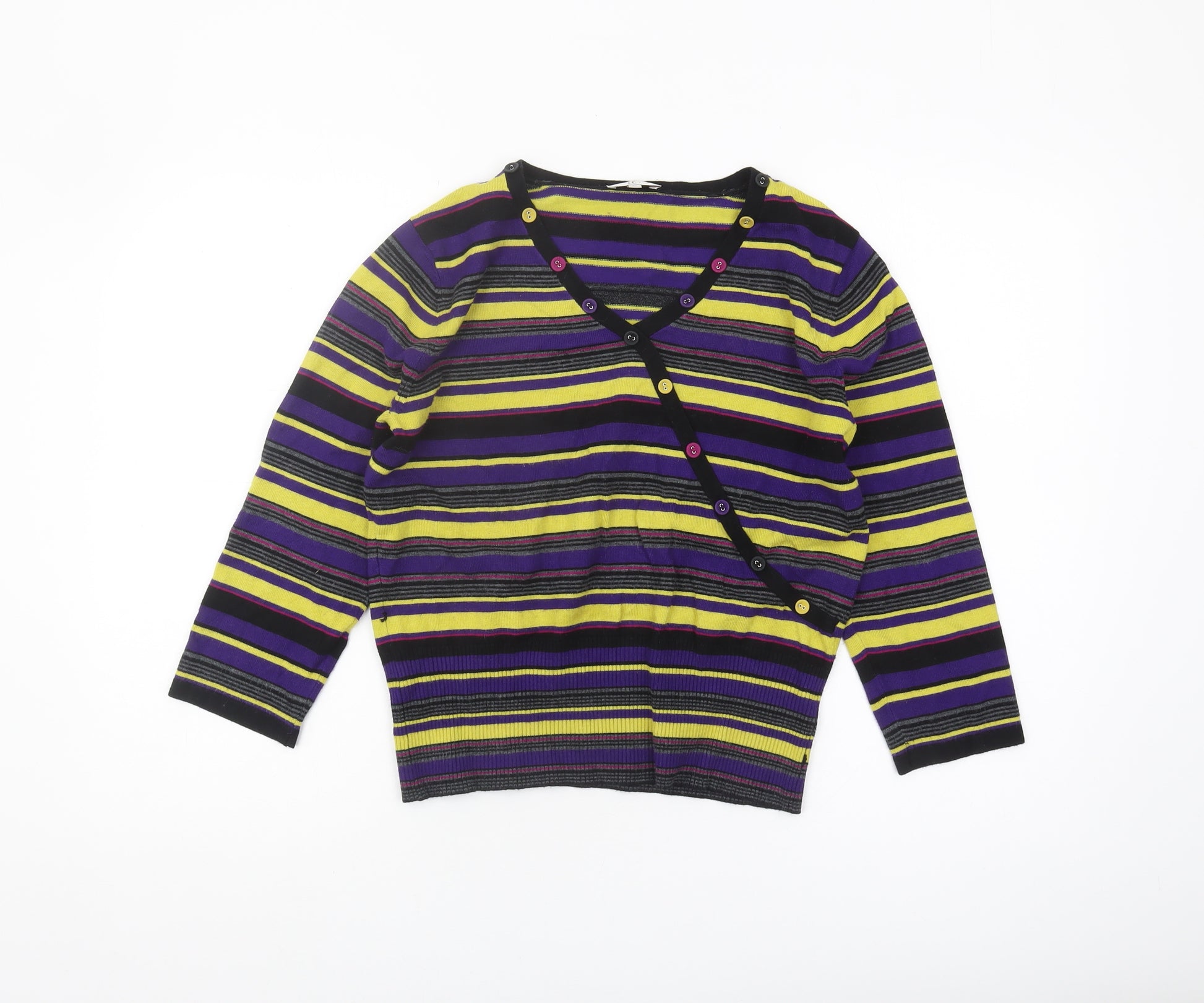 Enhance your wardrobe with this vibrant CC Women's Multicoloured Striped Cardigan in size M. Perfect for casual outings, this stylish cardigan features a striking combination of purple, yellow, and black stripes that will make you stand out. Crafted from a blend of viscose and nylon, this cardigan offers a soft and comfortable fit. The V-neckline design paired with long sleeves adds a flattering touch, making it versatile for different occasions. Whether you're heading out for a casual meet-up with friends or a breezy day out, this cardigan is your go-to option for comfort and style. The button accents add a classic touch, ensuring it remains a timeless piece in your collection. In excellent condition with no signs of wear, it's a fantastic addition to your wardrobe essentials. Pair it with jeans or a skirt for a chic and effortless look. Make this piece yours today and enjoy the perfect blend of comfort and fashion.